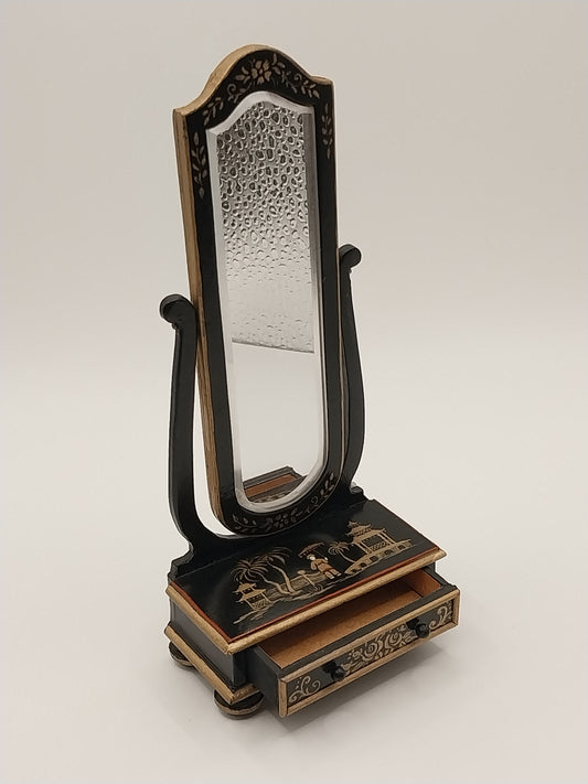Floor Mirror With Drawer, Oriental Motif, Handpainted