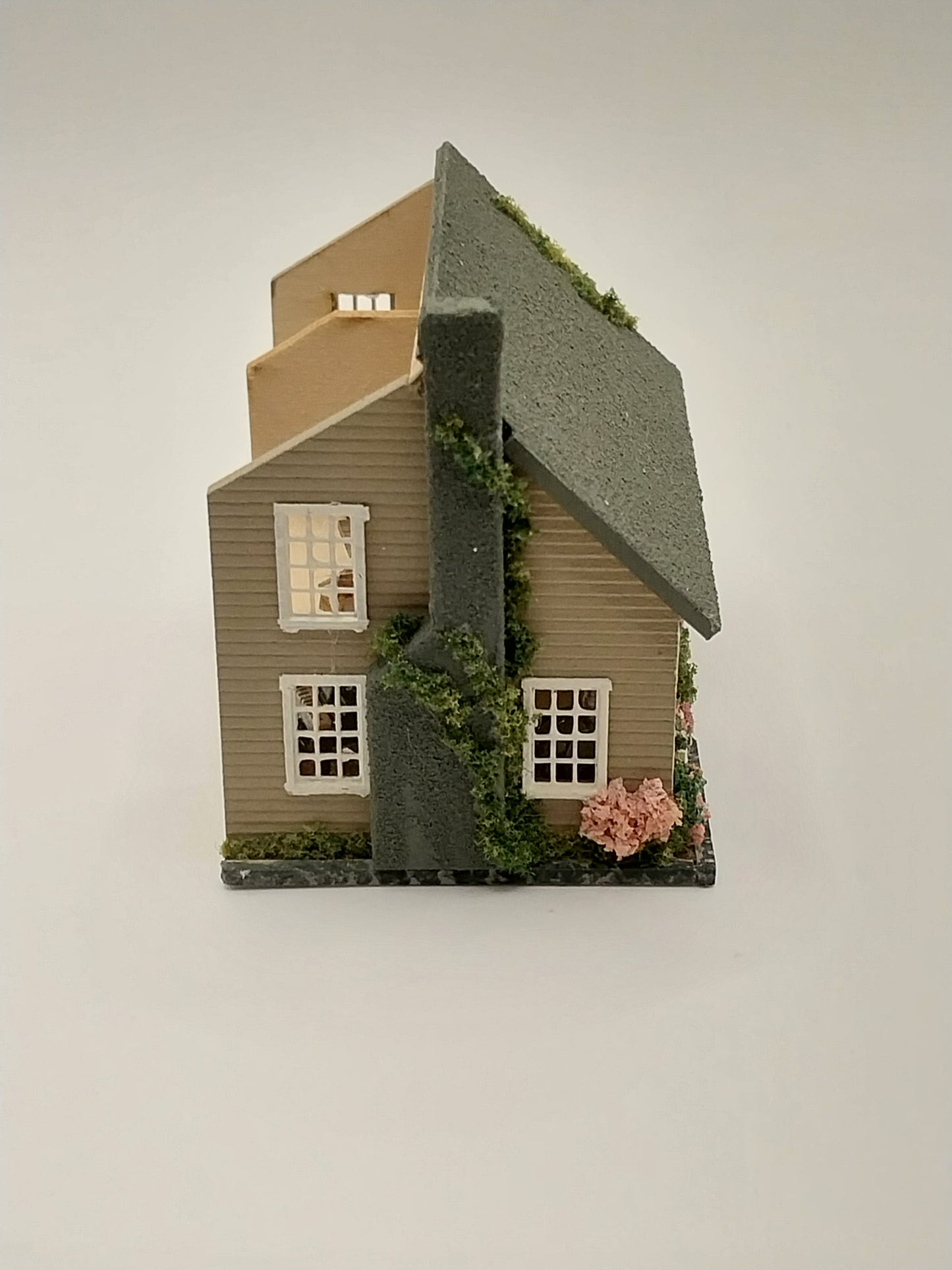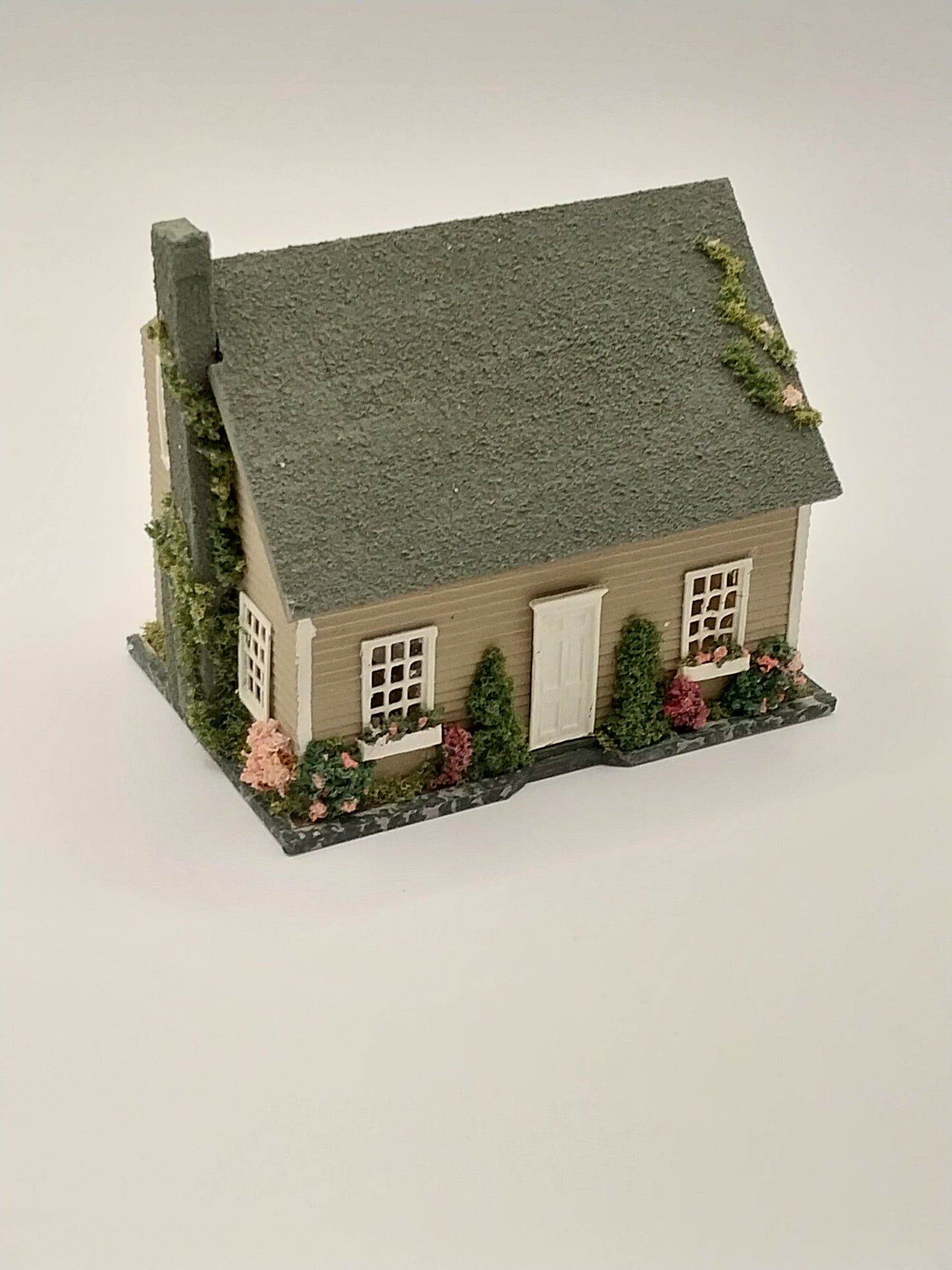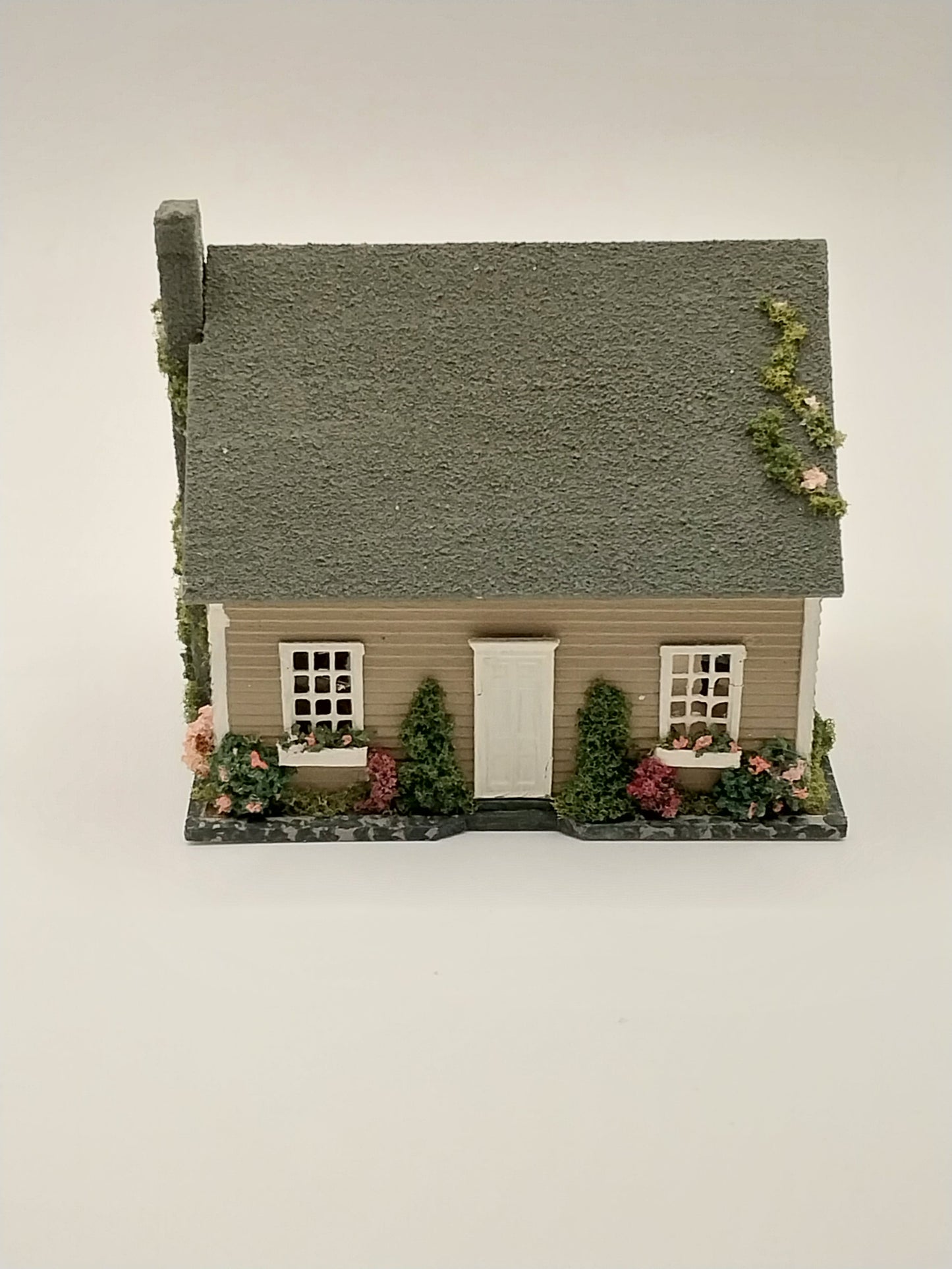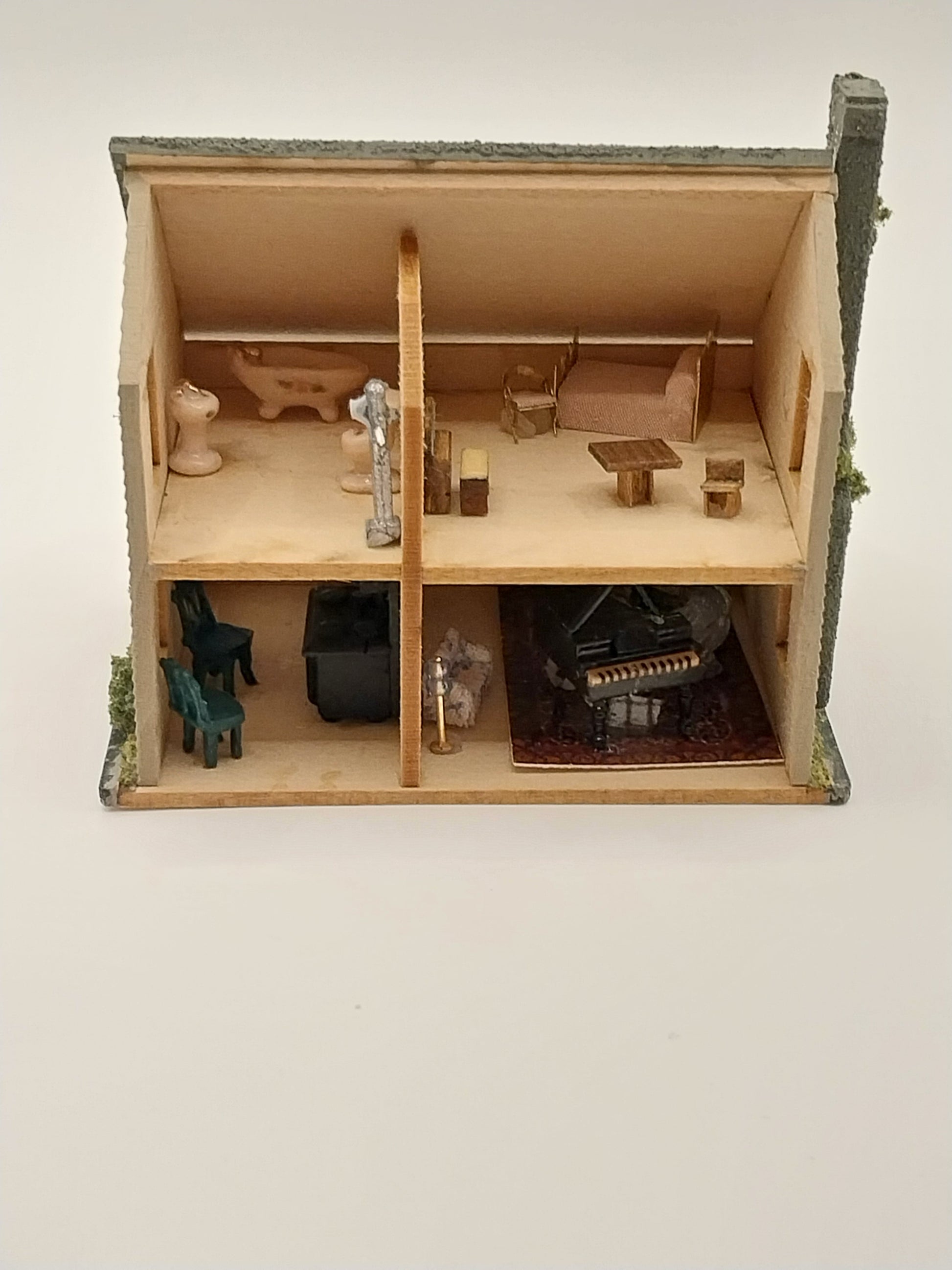This 1/144" Scale Dollhouse with furniture is made by Artisan Pat Russo. House is complete with exterior landscaping and interior furniture. House has 4 room furnished. House has bathroom, bedroom, kitchen, and living room. Piece is signed by Artisan.