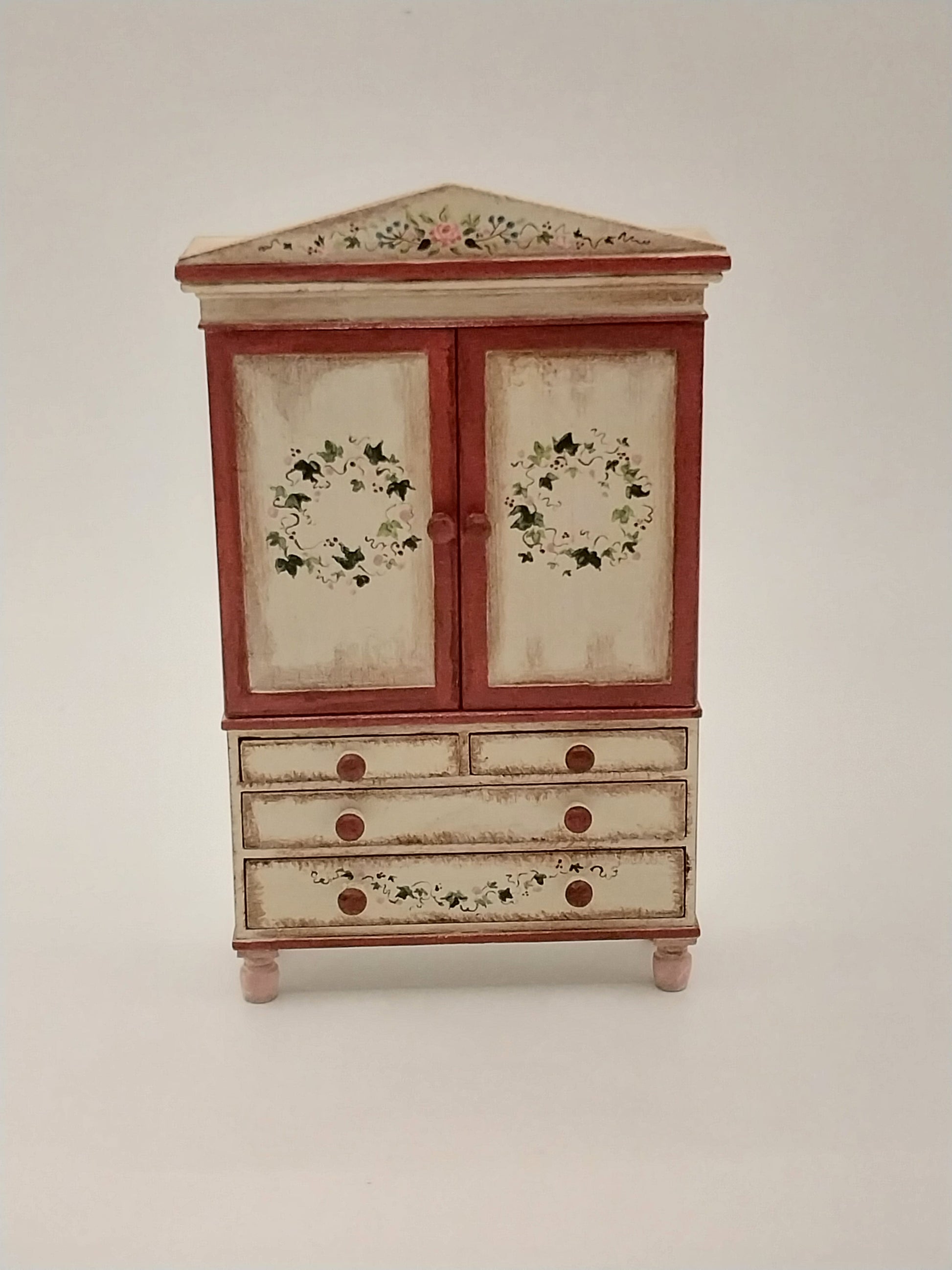 This 1/2" Armoire has ball feet and is hand painted by Artisan Karen Markland. Has double door that opens up 2 double shelf with 4 lower drawers. Armoire is a cream with burgundy accents and has green vine wreath design with pink floral design. Piece is signed by Artisan and dated 2000.