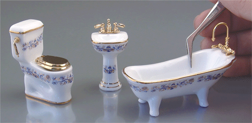 Three piece bathroom set with blue floral motif from Reutter Porcelain of Germany. Includes tub, sink, toilet.