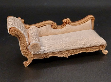 This 1/2" Scale Chaise comes in unfinished wood and can be stained or painted to match your room decor. Chaise has ivory fabric with matching bolster. Made in Spain