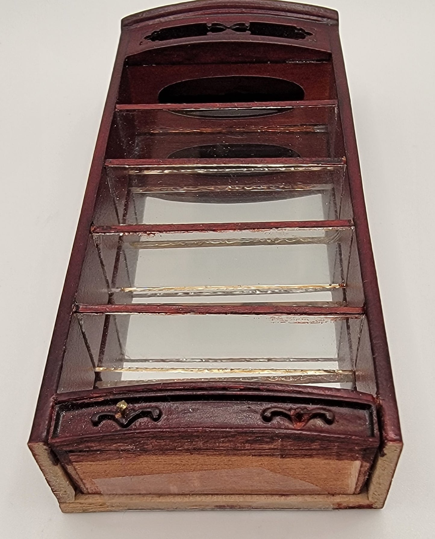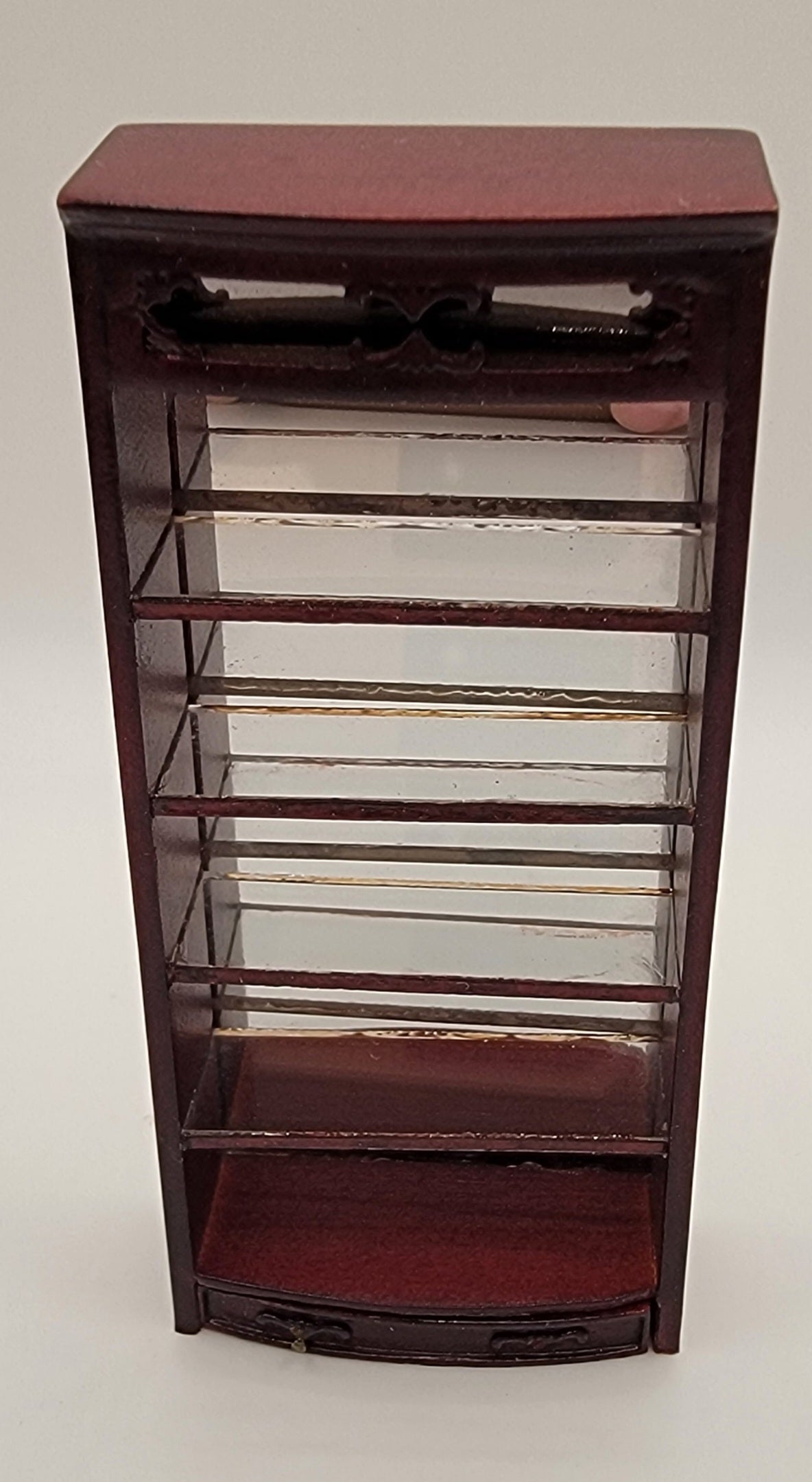 This 1/2" Scale Curved Emporium Display Shelf is made by Bespaq and comes in a Mahogany finish. Shelf has 5 glass display shelves with mirrored back and lower drawer. It is open in the back so that you can add led lights. Sold as is. Bottom piece of wood but does not distract from piece. Price is normally 74.99.