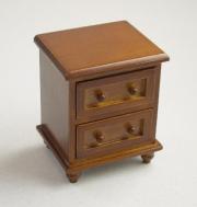 This is a simple but elegant HALF INCH SCALE wood night stand finished in a spice stain. The piece includes two recessed panel drawers with matching wooden knobs. The timeless style will coordinate with any style of decor. This piece also looks good as an end table in a living room or den.