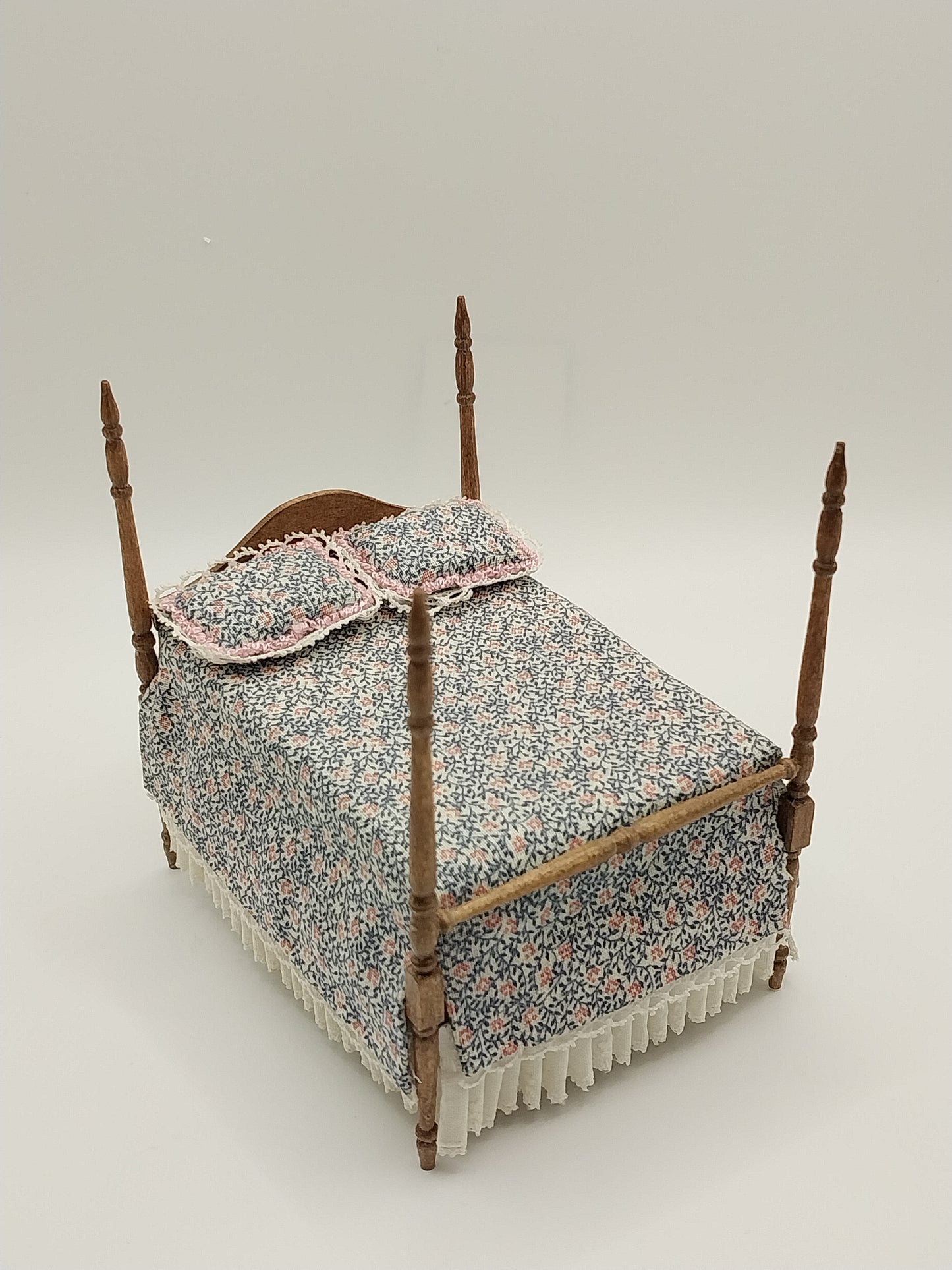 1/2" Scale Colonial 4 Poster Bed and Armoire Set. This Set is done in Walnut and is Handmade but Unsigned by Artisan. Bed is dressed in pink and blue floral design. Armoire opens up to closet space with lower drawer.