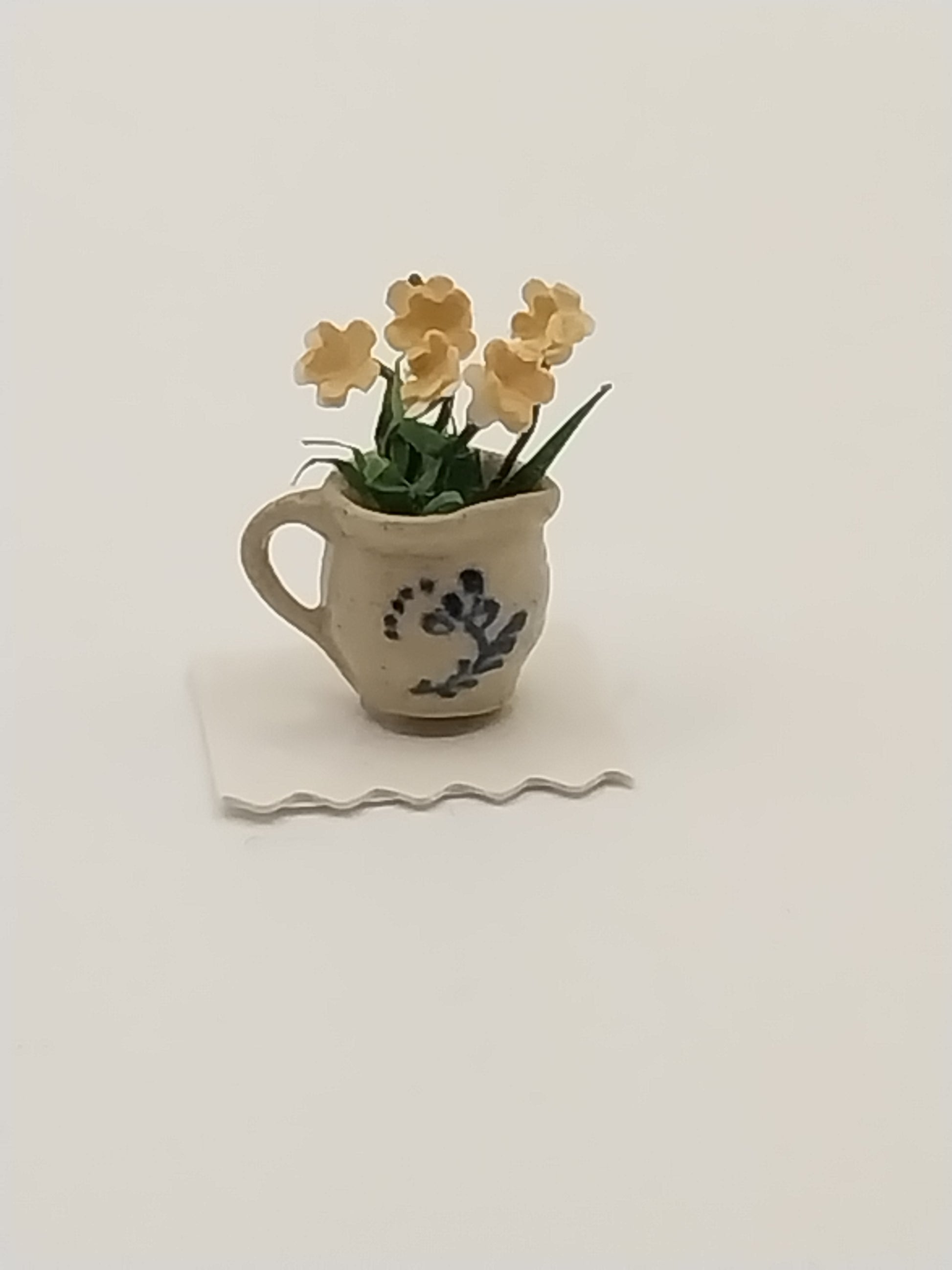 This 1/2" Scale Pottery Pitcher is made by Artisan Jane Graber. Pitcher is filled with Daffodils.