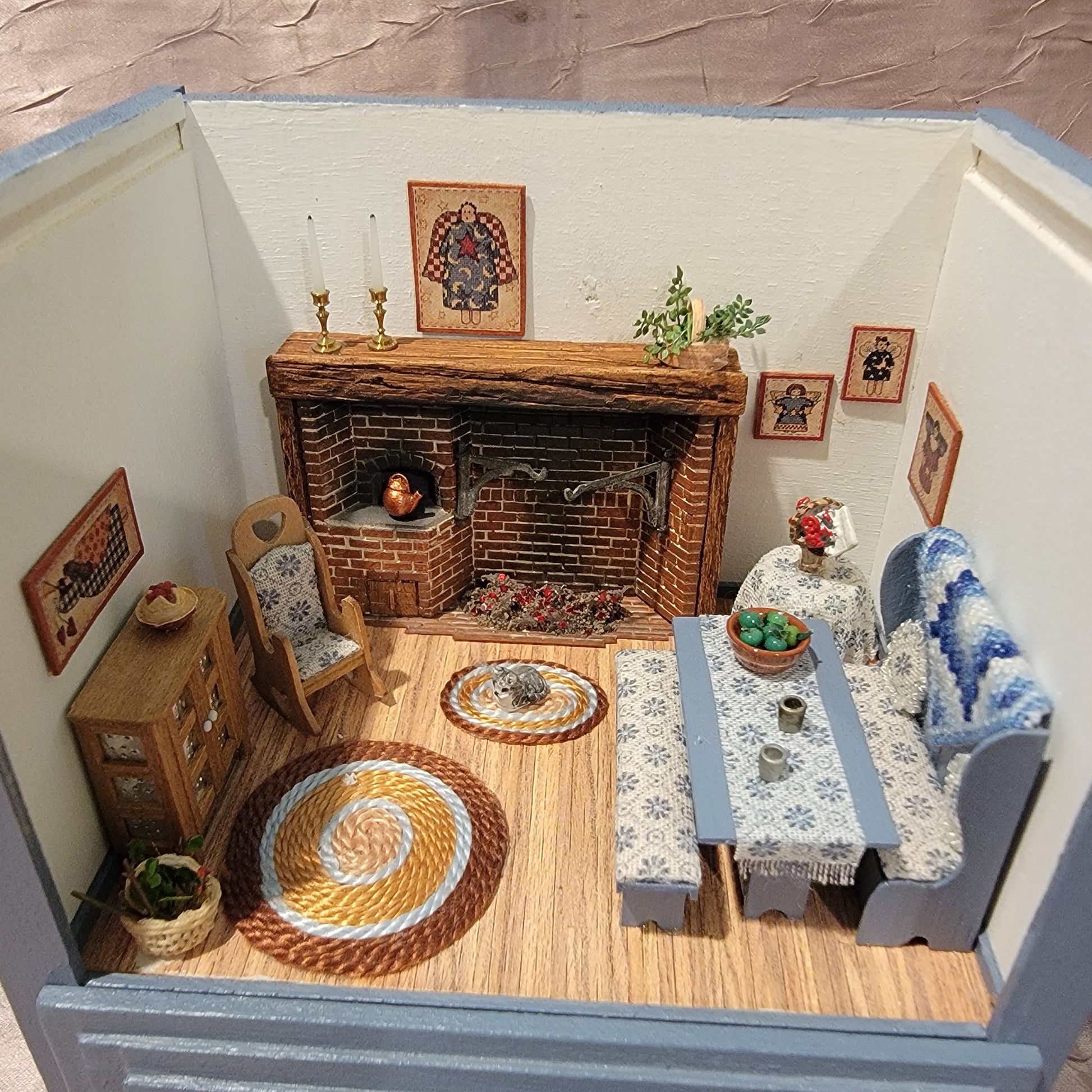 Unique handmade 1/4" vignette created and finished by a very talented artisan, Carol Friedrichsen. The top of the box slides off and the front plexiglass slide up to get to the items inside. The drawer on the bottom opens and was intended to hide a battery powered system if you wanted to battery powered lights. She did place any in this project. The interior is all decorated as an old country kitchen with settle and Braxton Payne cooking stove. The furniture is all done by Susan Hoeltge, brass candlesticks by T E Brownwell, hand braided rugs, hand painted calico grey cat, and even a 1/4" bowl filled with apples by Jane Graber. Lots of talent in this box and priced at an incredible value of $119.99. The value is much more than this.