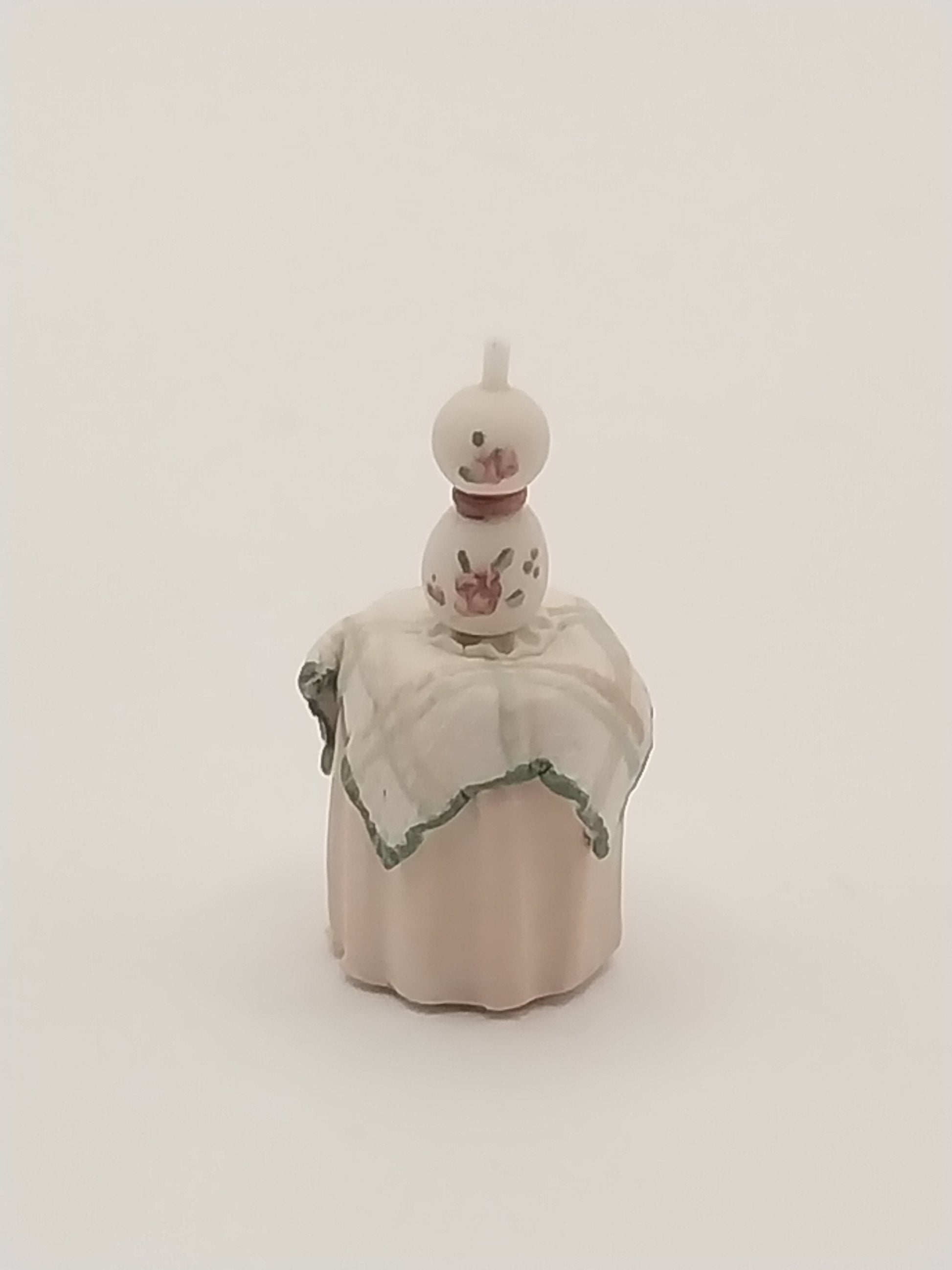 This 1/4" Scale Side Table with Lamp is hand sculpted of polymer clay and hand painted by Artisan Karen Gibbs. This piece was done for the Victorian Parlor and Boudoir Structure. Table has light pink skirt with pink and green top and lamp has rose floral on shades.