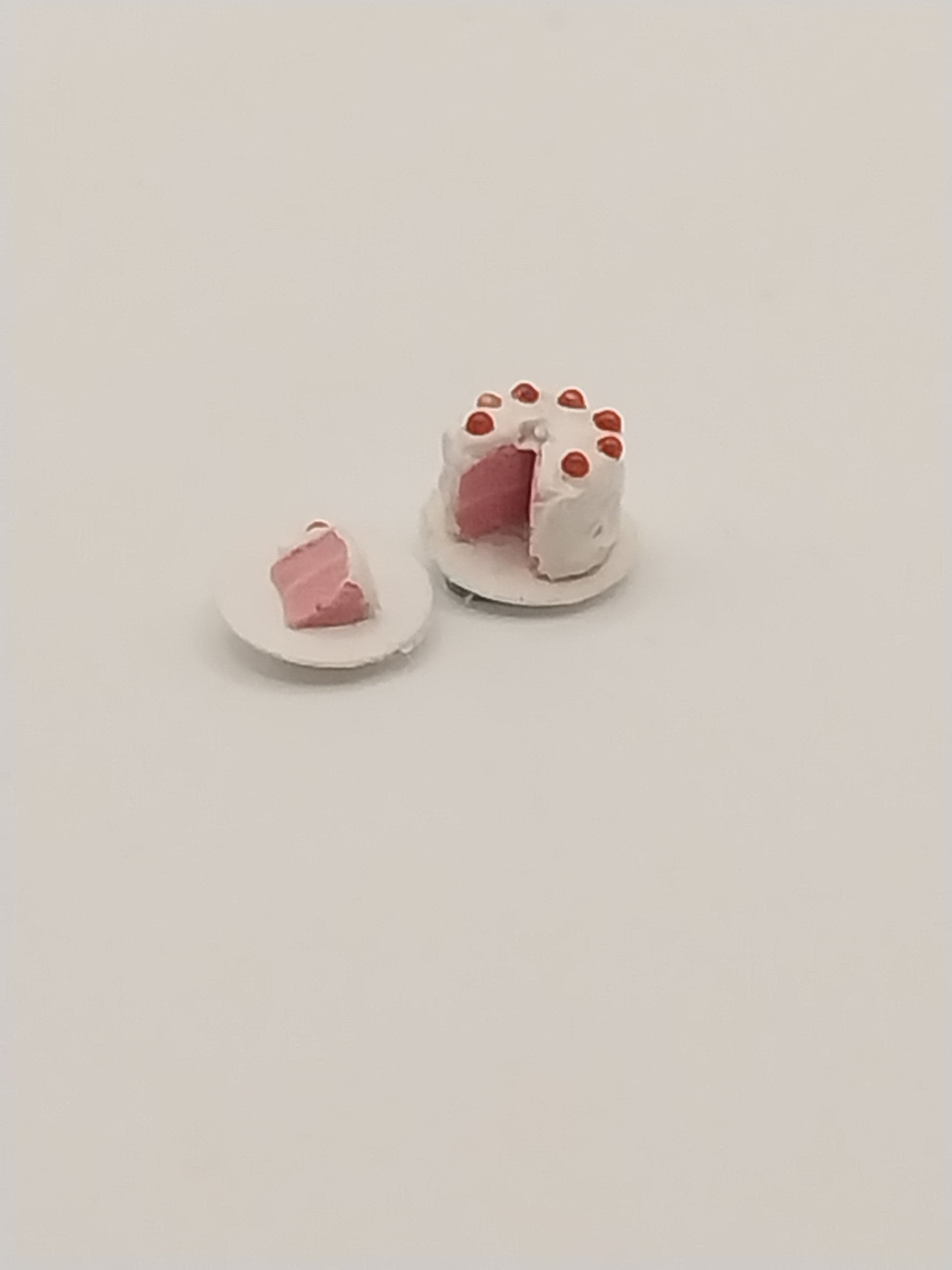 1/4" Scale Strawberry Cake with a slice cut out, along with a plate with a slice of strawberry cake. This piece is made by Artisan Karen Gibbs.