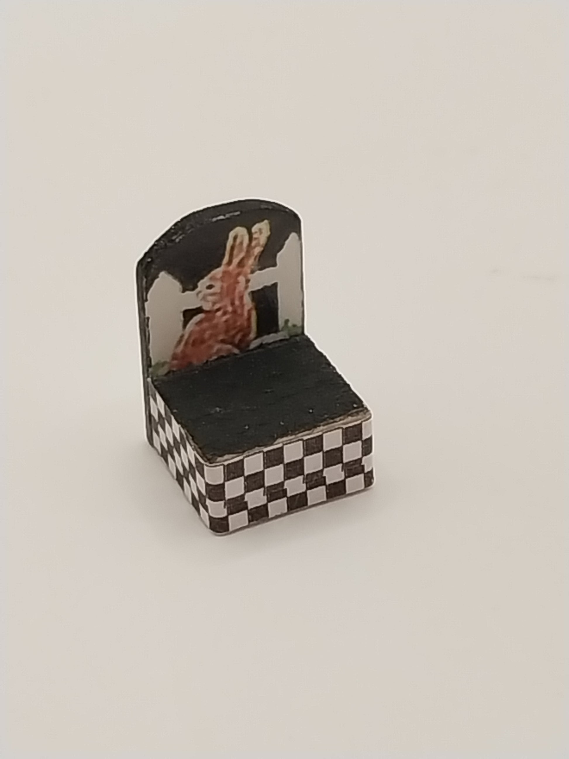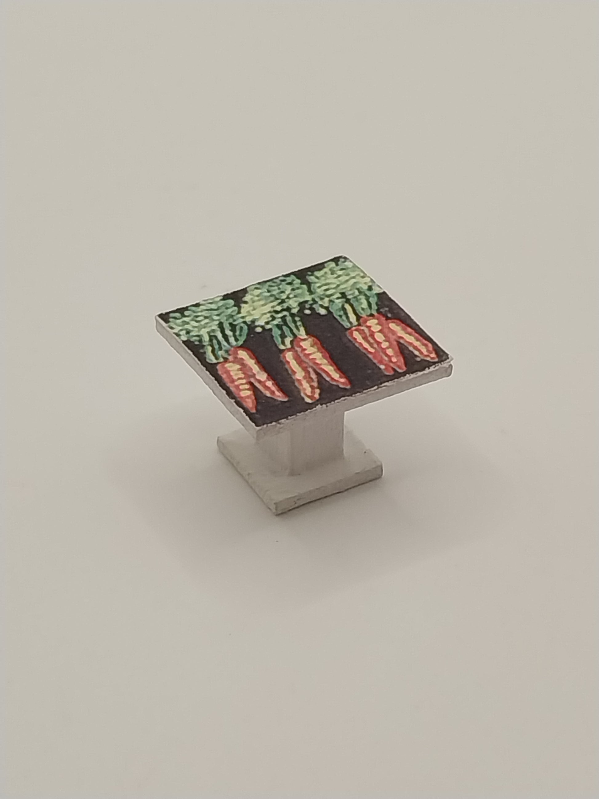 This 1/4" Scale Garden Table and 2 Chairs is handmade by Artisan Susan Hoeltge. Set includes square table with Carrot stalks design on top and 2 chairs trimmed in black and white check with Bunnies on each chair back. Table is signed by Artisan.