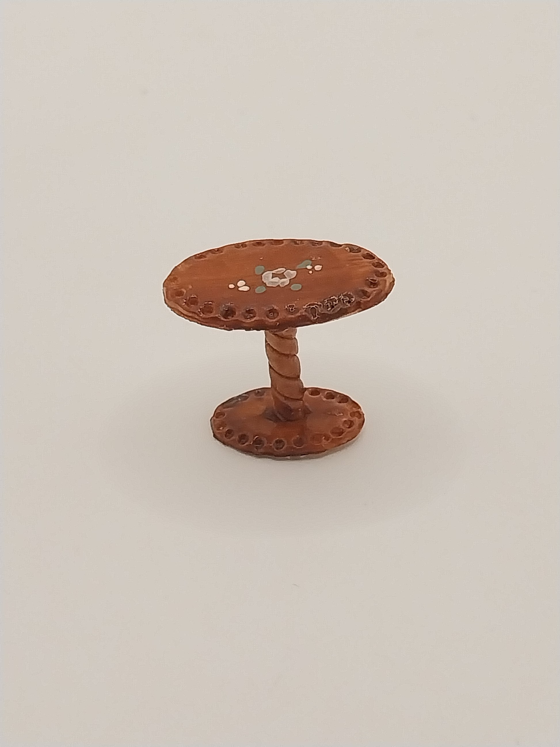 This 1/4" Scale Oval Tea Table and Tea Set is hand sculpted, of polymer clay, and hand painted by Artisan Karen Gibbs. Table is stained and has hand painted floral design. Tea set includes teapot, and 2 cups and saucers on gold tray. This Piece was done for the Victorian Parlor and Boudoir Structure.