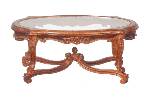 This 18th Century Coffee Table comes in a Walnut finish and has a glass top. Table has detailed embossed carved wood.