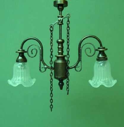 This 2 Arm Down Gas Pendant Light has Frosted Serrated Bell Shades. Light has replaceable bi-pin bulbs and works with a 12 Volt Electrical System