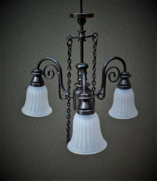 3 Arm Bronze Down Light with Frosted Ribbed Bell Shades, works with a 12 Volt Electrical system and has replaceable bulbs
