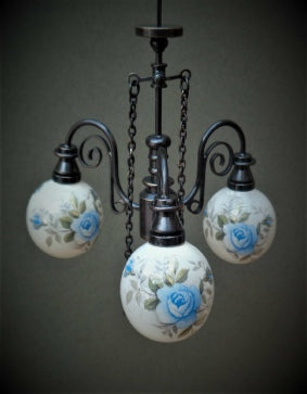 3 Arm Down Gas Down Light with Blue Rose Ball Shades. Works with a 12 Volt Electrical System and has replaceable bulbs.
