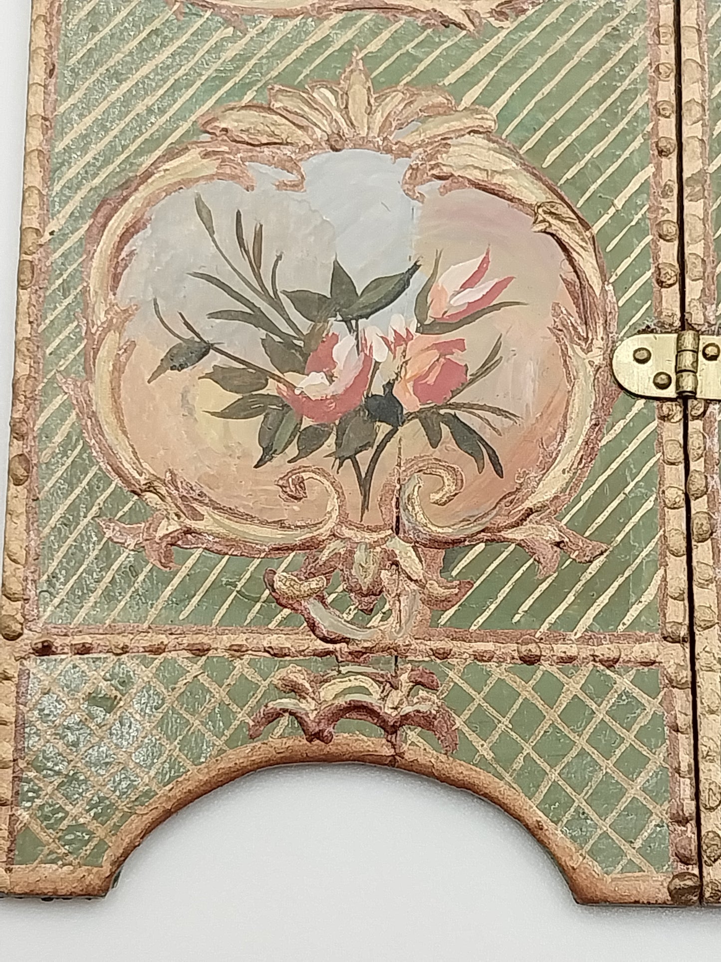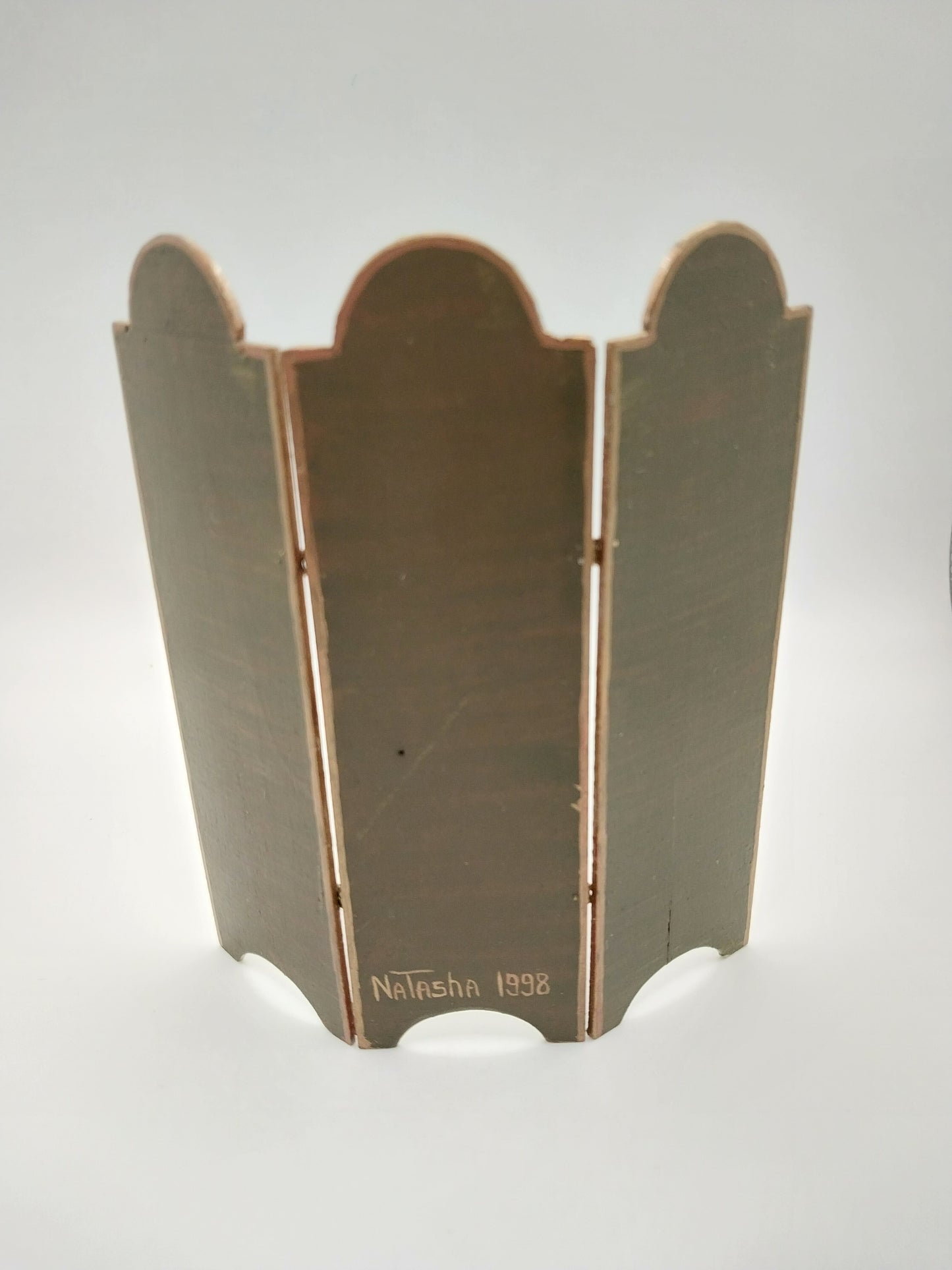 This 3 Panel Renaissance Cupid Screen is hand painted by Artisan Natasha Beshenkovsky. Screen has hand painted Renaissance Cupids and floral design. This Screen does have a small crack on bottom left panel that the Artisan has painted over. This Piece is signed by Artisan and dated 1998. This Screen Panel was Originally $1350.00, Now Only $799.99.