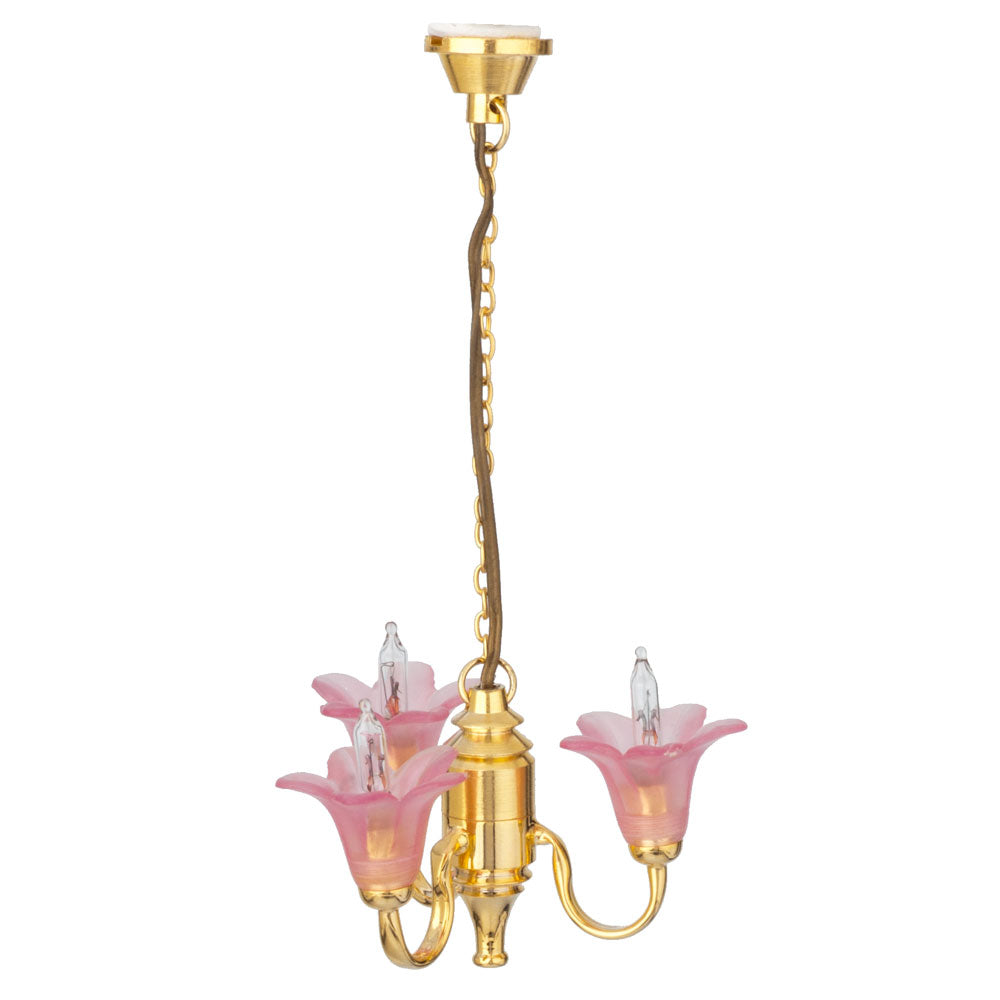 3-Up Arm Pink Tulip Chandelier 3-Up Arm Chandelier with removable pink plastic tulip shades that unscrew. Replaceable candle flame bulbs and works with a 12 Volt Electrical System