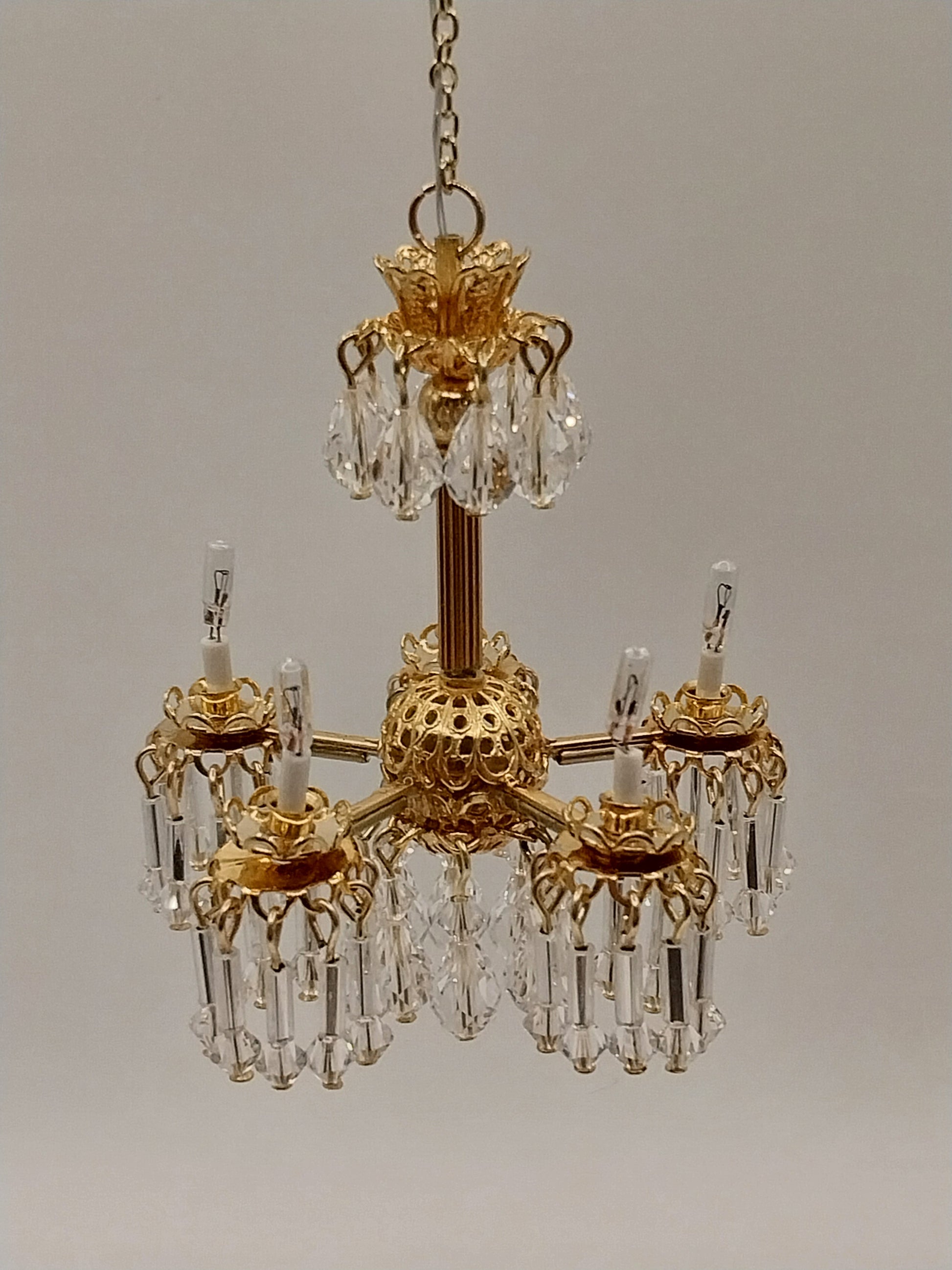 4 Arm Candle Sophia Crystal Chandelier has hanging crystals on top and lower part of chandelier as well as hanging crystal bugles from each arm. Chandelier has replaceable bulbs and works with a 12 Volt Electrical System.