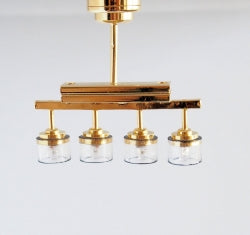 The on/off switch is located in the base with the battery. Has 4 modern lights that point down with glass shade.