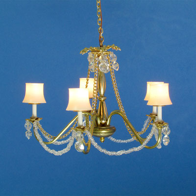 Five light brass and crystal chandelier. Gold colored shades. Replaceable bi-pin bulbs and works with a 12 Volt Electrical System. You can get a matching sconces #553