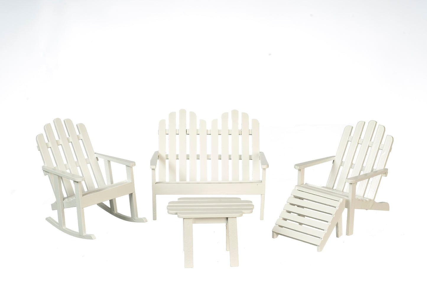 Adirondack 5 piece set in a white finish. Set includes double Adirondack Chair, Single Adirondack Chair, Rocking Chair and table