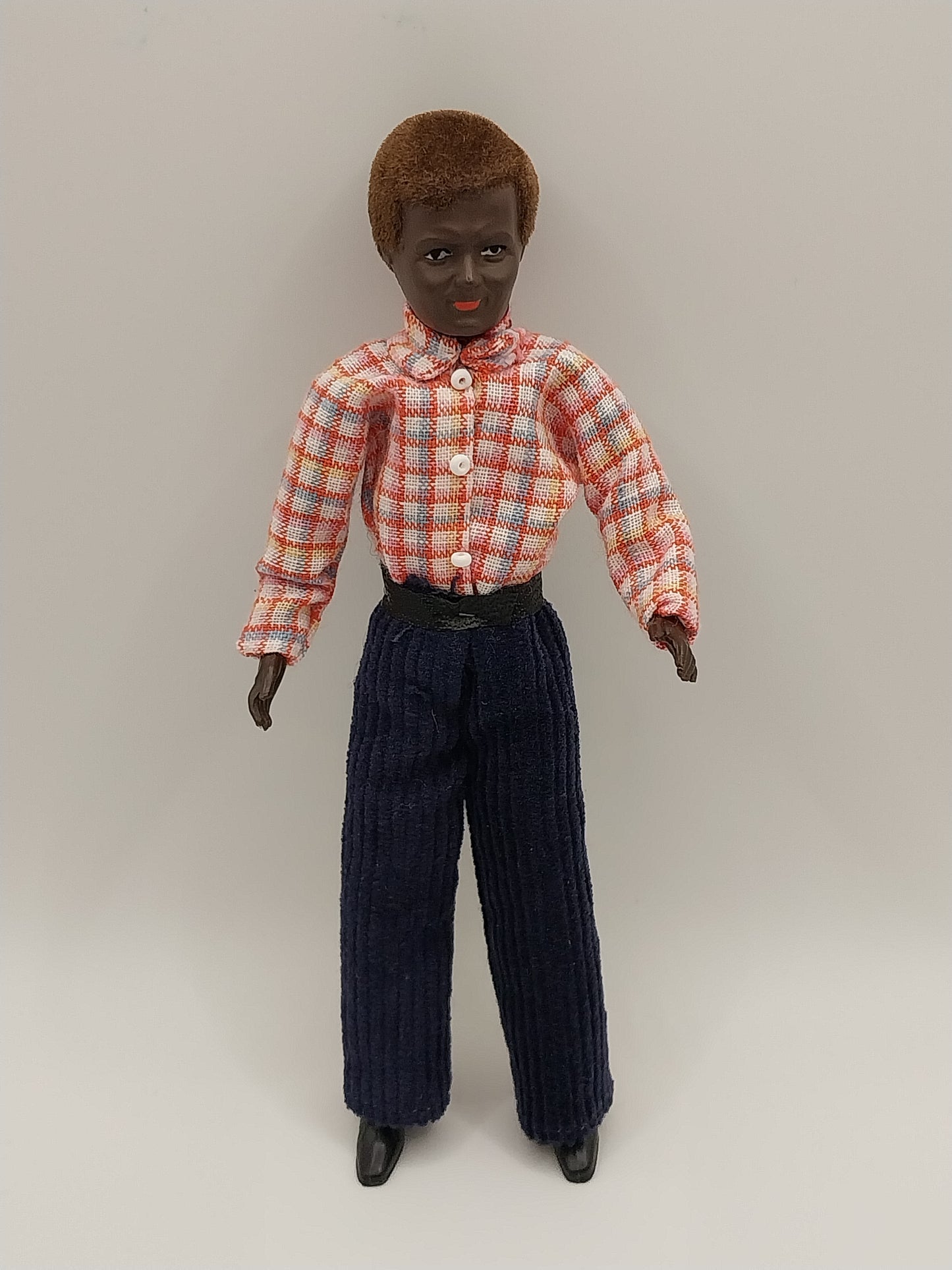 African American man made with Polymer Face and Hands. He is wearing a plaid shirt, belt, navy corduroy slacks, and black shoes. These dolls by Caco were first made in the 70's in West Germany. They were wonderfully made to be very bendable for sitting, standing, or any pose desired for your scene.