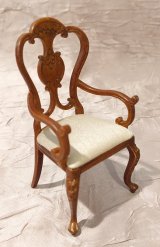 American Victorian Dining Room Set comes in a Walnut finish and includes Dining Room Table, 2 Arm Chairs, and 2 Side Chairs. Chairs have a light tan shine fabric seat.