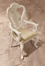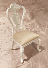 American Victorian Dining Room Set comes in a White finish and includes Dining Room Table, 2 Arm Chairs, and 2 Side Chairs. Chairs have a light tan shine fabric seat.
