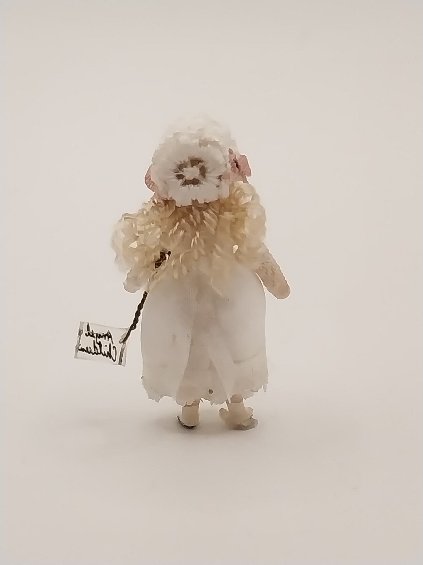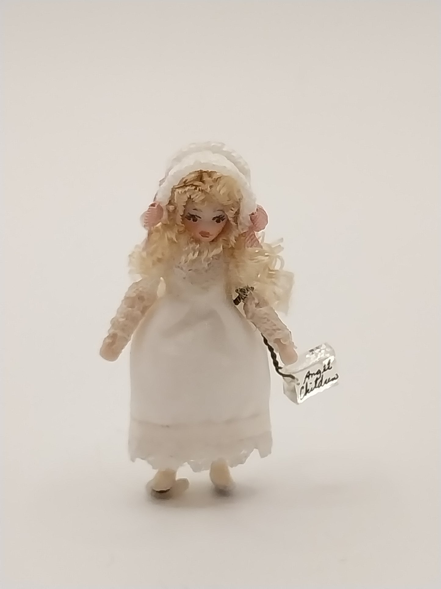 She is wearing a white dress with matching bonnet and has long blonde curls.