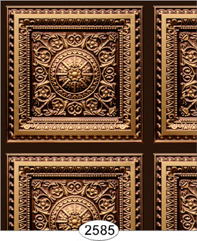 Paper to simulate paneled wall or coffered ceiling. Paper is flat and not physically embossed. It is a trompe l'oeil effect to mimic embossed metal or engraved wood. Can use smaller scale paper for border.