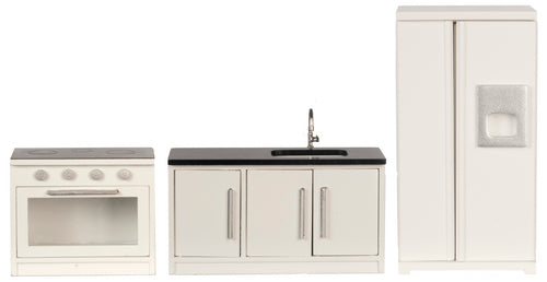 Kitchen Appliance 3 piece Set includes Refrigerator, Sink with counter, and Stove. Comes in White with black and silver accent finish