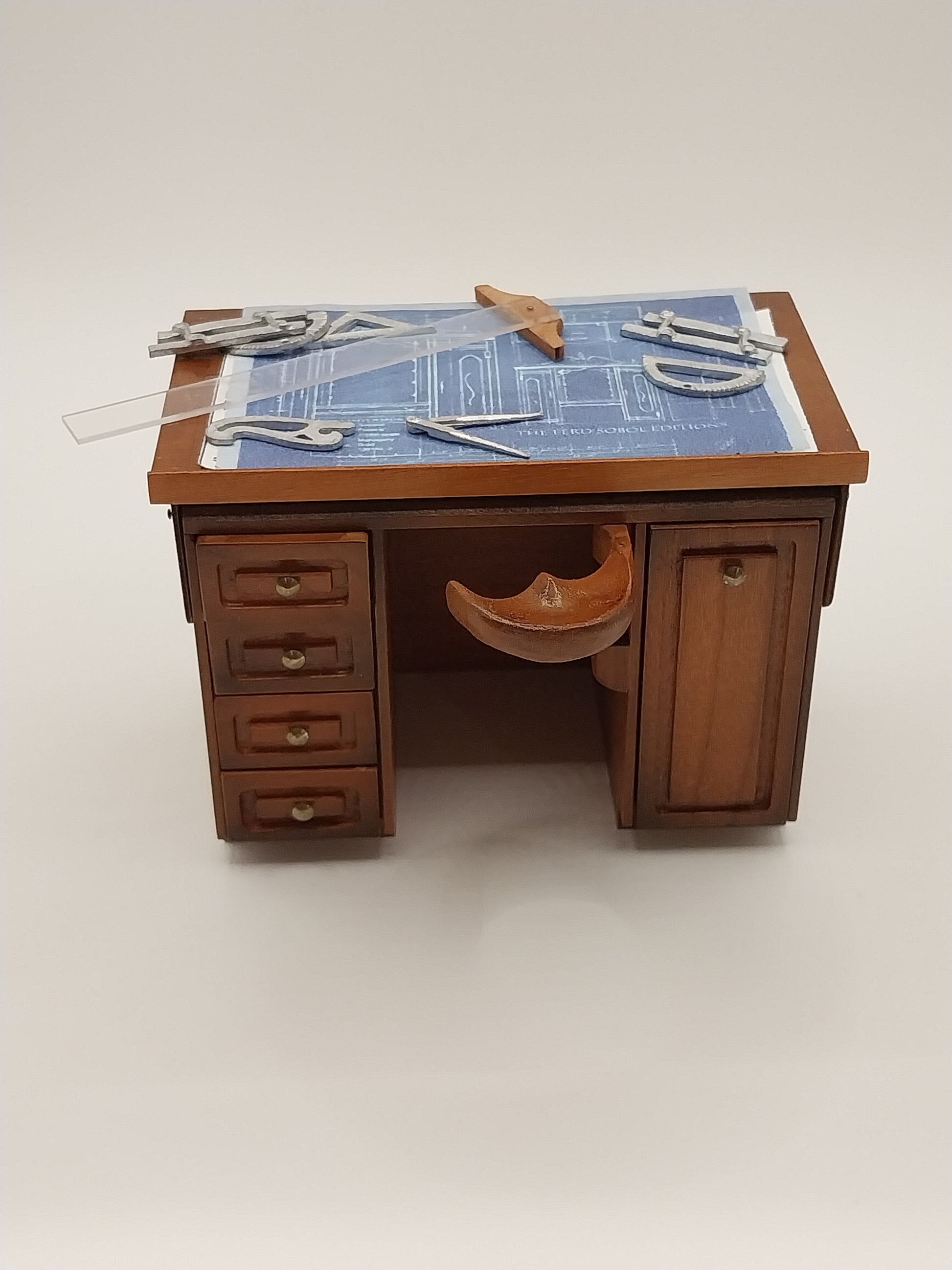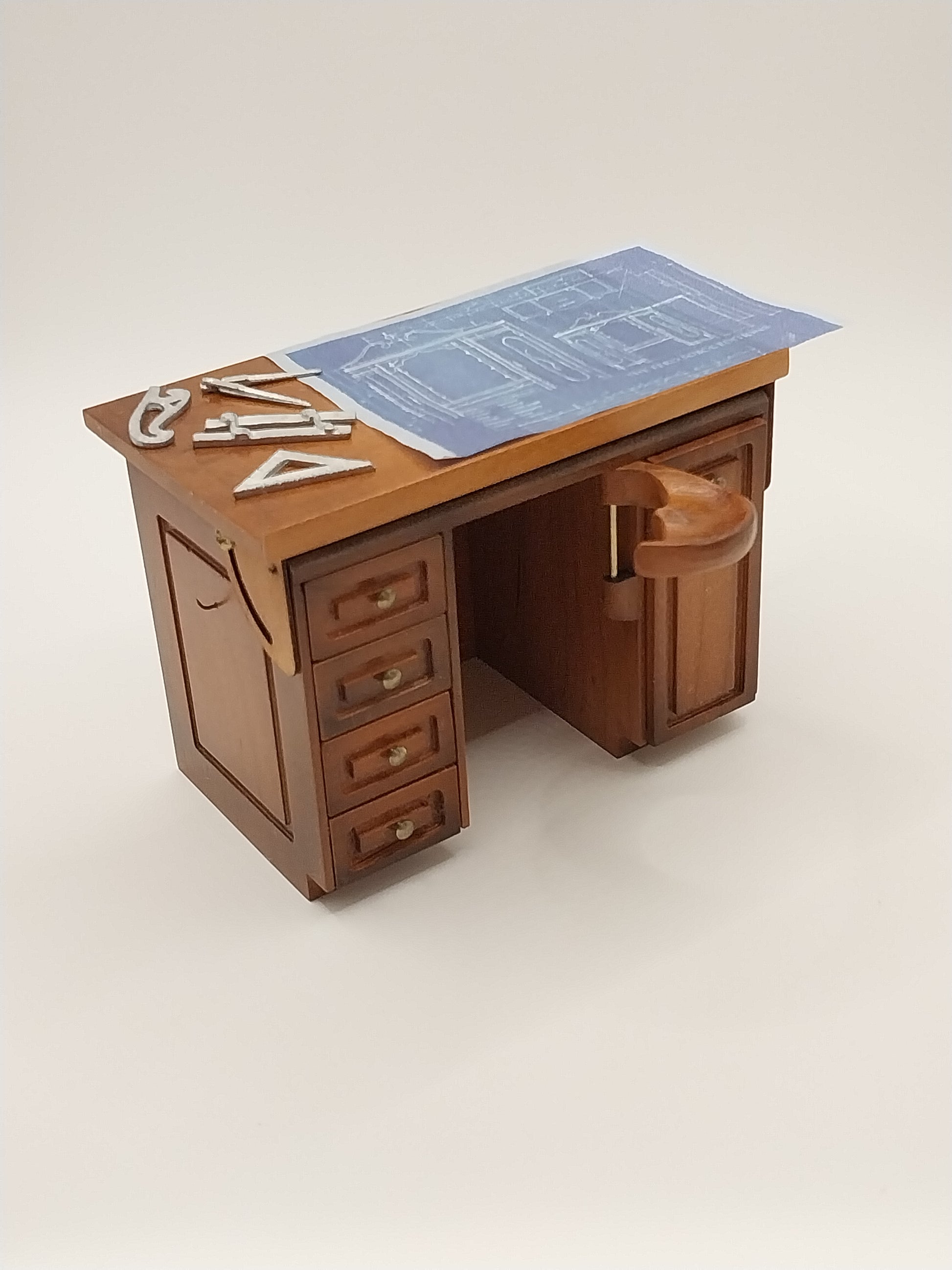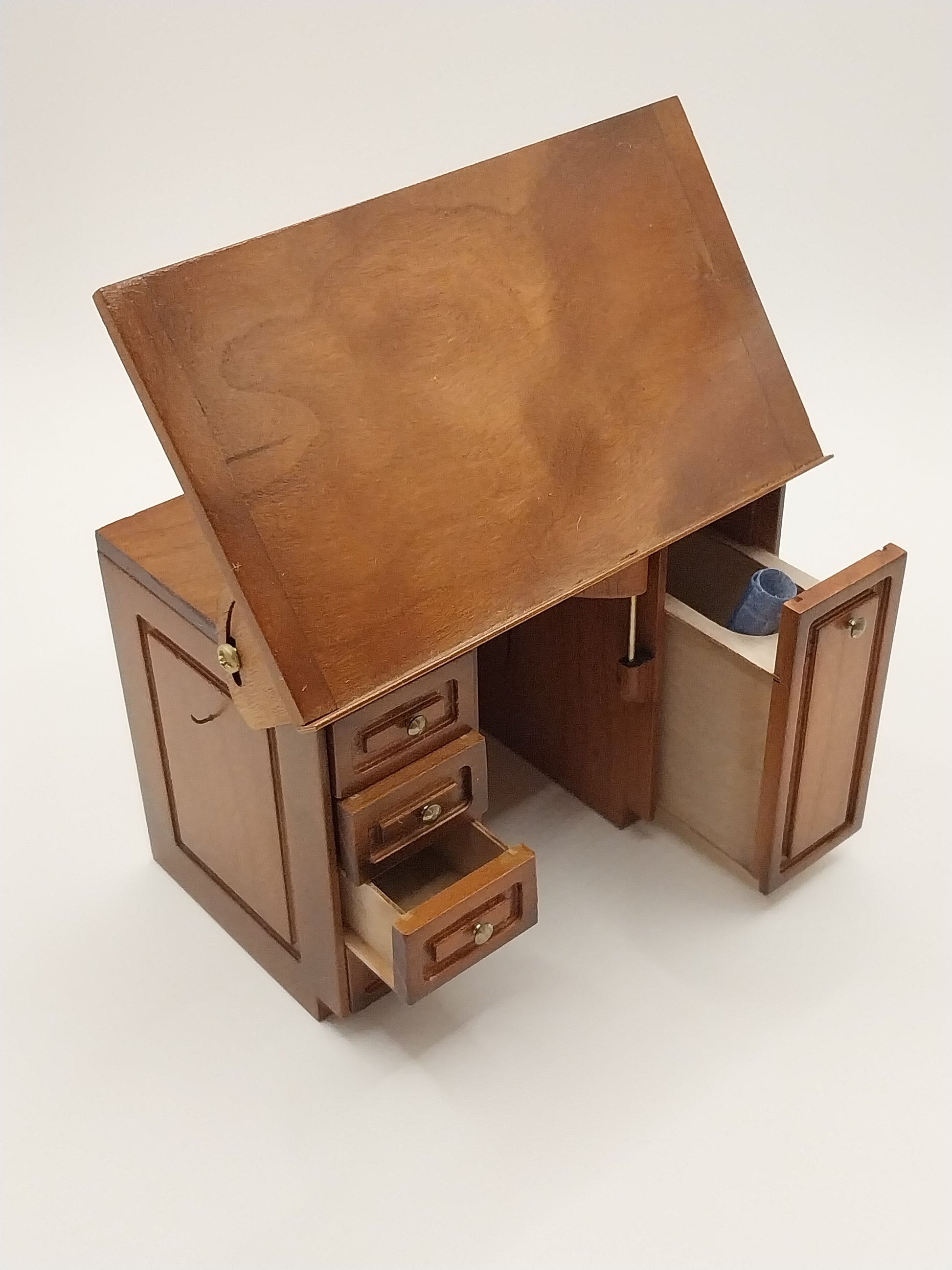 This Architect Desk is a Very Rare Piece made by the late IGMA Artisan Ferd Sobol. Desk has 4 working drawers and side cabinet that opens to hold architect plans. Has hinged sitting chair. Top of desk lifts up. Desk comes with architectural tools and plans. Piece is signed by Artisan.
