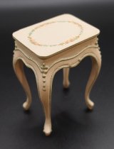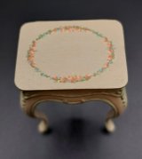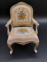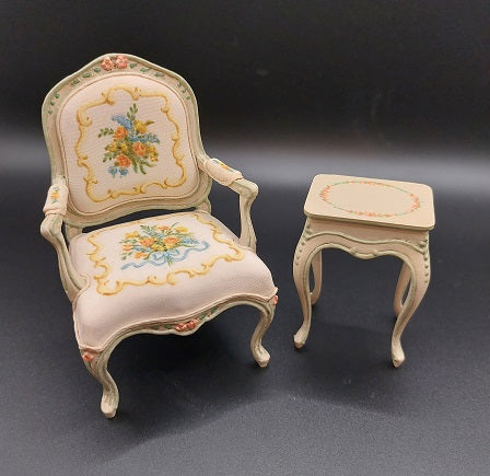 This Arm Chair and Side Table is hand painted by Artisan Charles Krug. Arm Chair has cream fabric with hand painted floral bouquet in blues, yellow, and coral with gold and yellow ribbon trim. Chair and table are both hand painted in an Ecru with warm sage accents. Chair also has pink floral on trim and table has peach floral wreath on top. Both pieces are signed by Artisan and the chair dated '90 and the table is also dated '90 and #9/12.