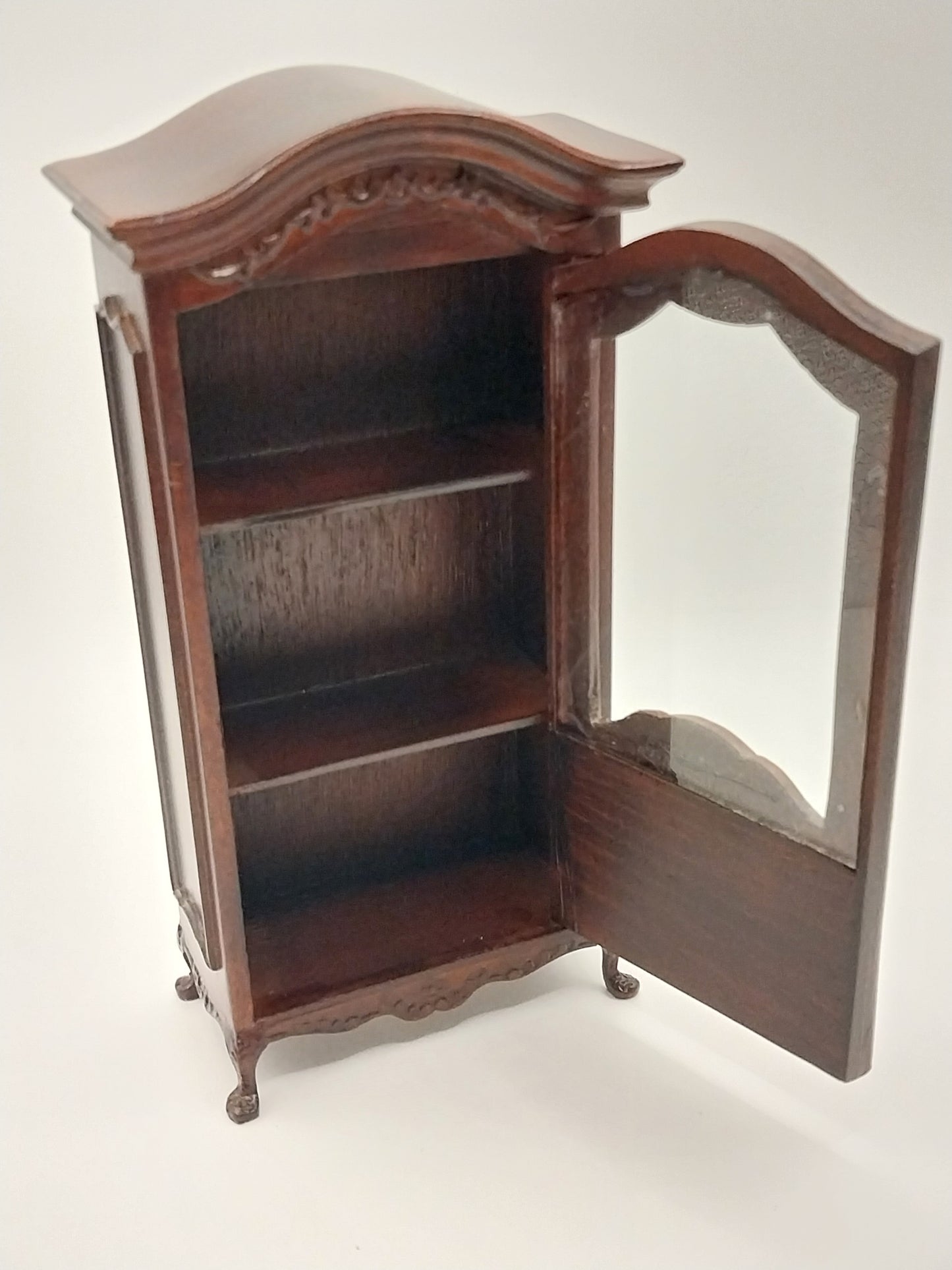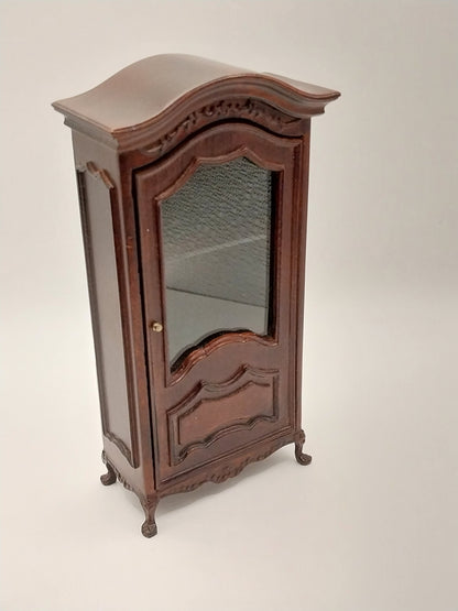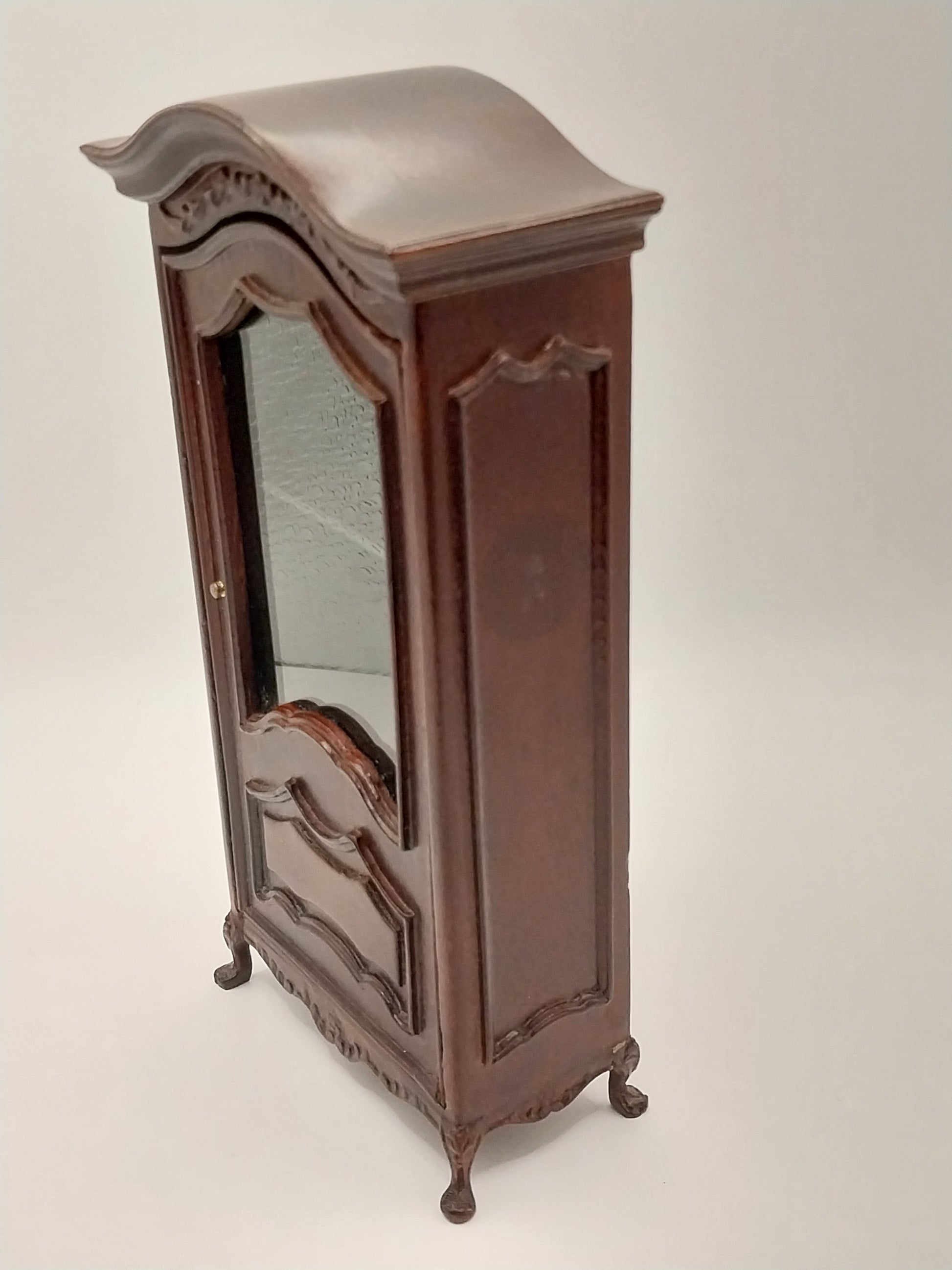 This Carved Armoire is made by Bespaq and comes in a Mahogany finish. Armoire has half glass front door that opens up to shelves. Side of Armoire does have a small round glue mark. This piece was Originally $74.99 and NOW ONLY $59.99