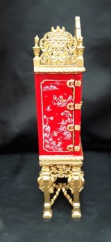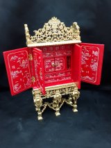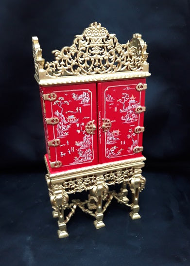 This Armoire is made by Bespaq and comes in a Red finish with Gold accents. Armoire has hand painted Chinoisere Oriental scene in white, blue, peach, and pink. Has very intricate and detailed carved wood in gold. Armoire has double doors that open up to another set of double doors that open up to a variety of storage places.