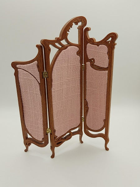 This Art Noveau Bedroom Screen comes in a Walnut finish with pink fabric screen. Has matching bed, armoire,nightstand,vanity & chair available under # JBM8033, 8035,8034, & 8032.