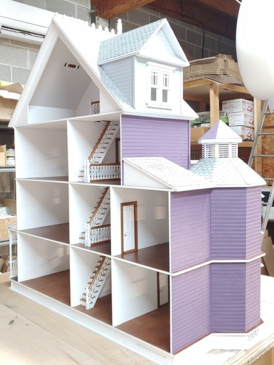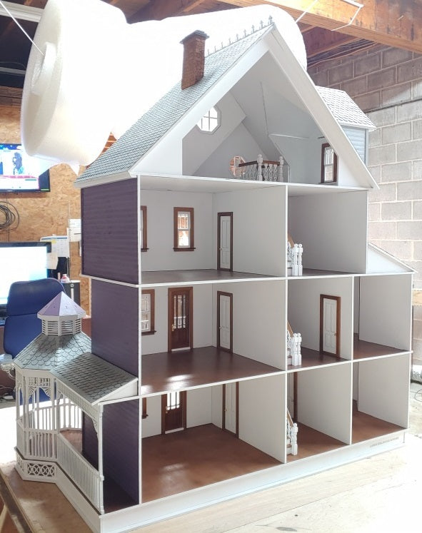 This kit come with 11 single non-working windows, three staircases with landing and newel post. 5 working 4 raised panel interior doors, 4 double non-working windows, two working main entry and balcony doors, one double working balcony door, detailed porch, balcony railings, seamless contacting walls, detailed turret and gazebo roofing, gables, roof crest w/ running trim, two octagon peak roof windows, and chimney. This is a huge dream house for anyone wanting a dollhouse to decorate and customize to your liking!