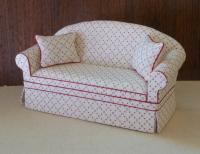 This is the Ashley Sofa in our newest fabric. The fabric is a crisp cotton with a cream background and a tiny red dot pattern. This is a very versatile fabric which can work in an elegant setting or equally well in a more casual or country style room. The sofa has a simple skirted bottom with corner pleats, rolled arms and a gently rounded back. One matching pillow is included and both the sofa and pillow are beautifully finished with coordinated red trim. The feet are wood. A matching chair A161 is available.