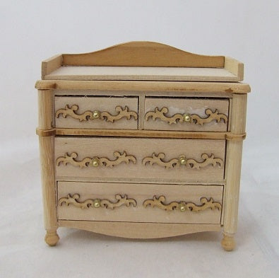This Baby Chest of Drawers comes in an unfinished wood and is made in Spain. Chest has 2 small drawers and 2 large drawers with laser cut detailed embossed wood design. Chest comes with removable changing table top. Piece can be stained or painted to match your room decor.