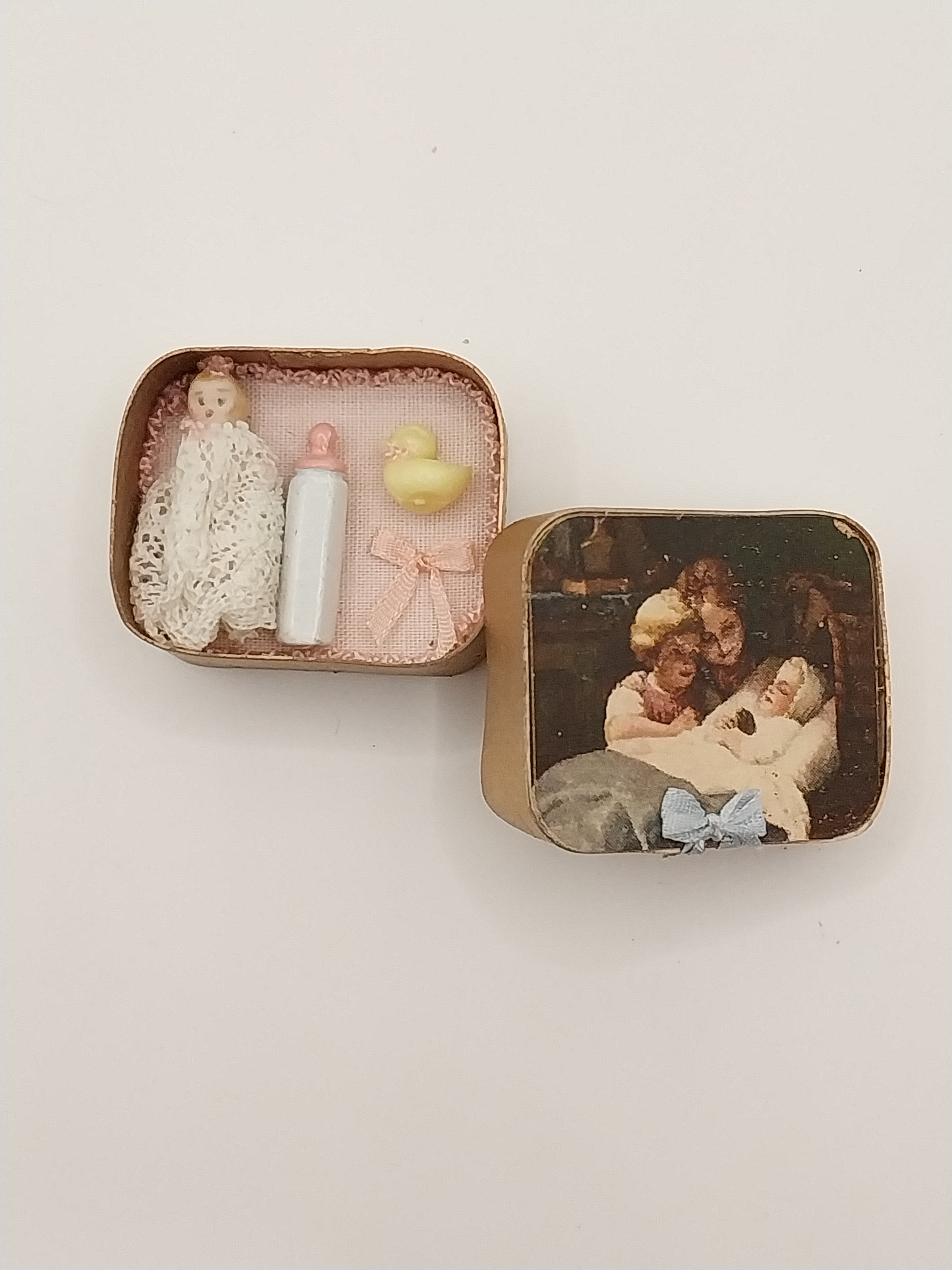 This tiny baby doll comes in a decorative box with a baby bottle and toy duck.