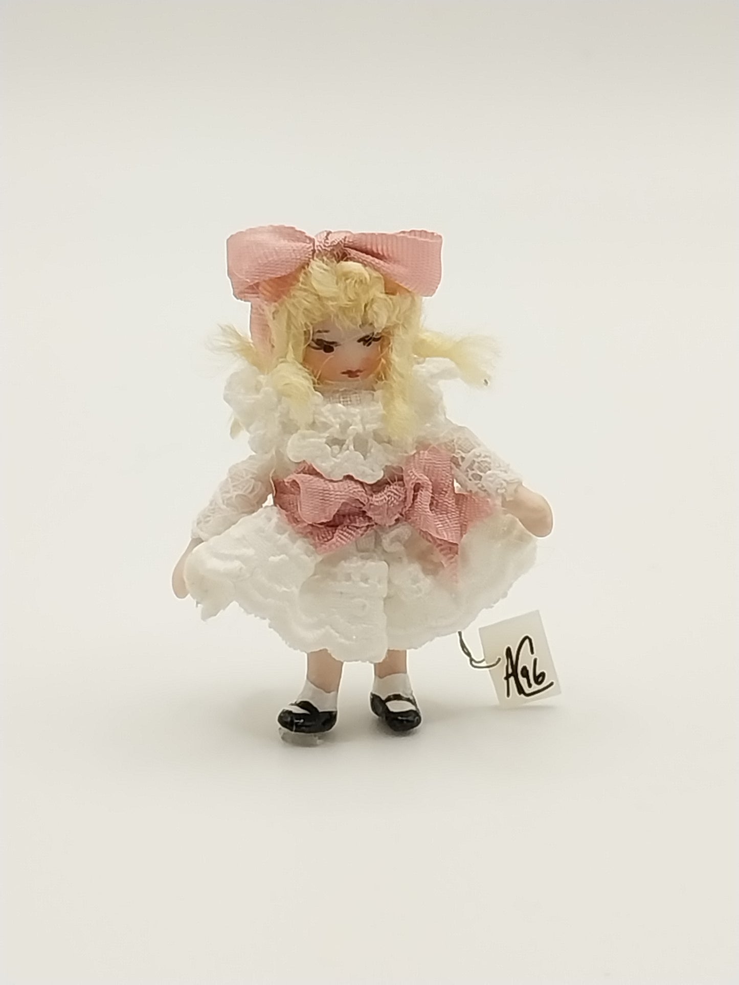 This Baby Doll is made by Artisan Ethel Hicks of Angel Children. Baby Doll is wearing a white lace dress with rose ribbon. She has blonde hair with rose ribbon bow.