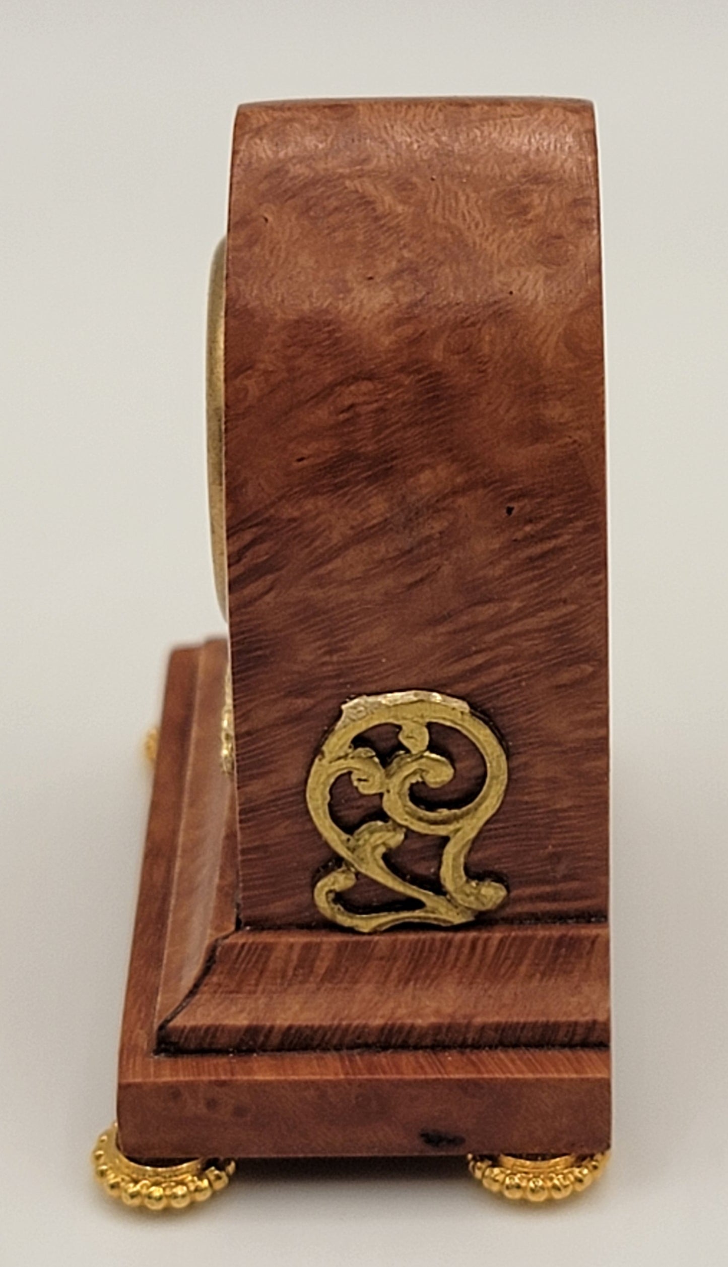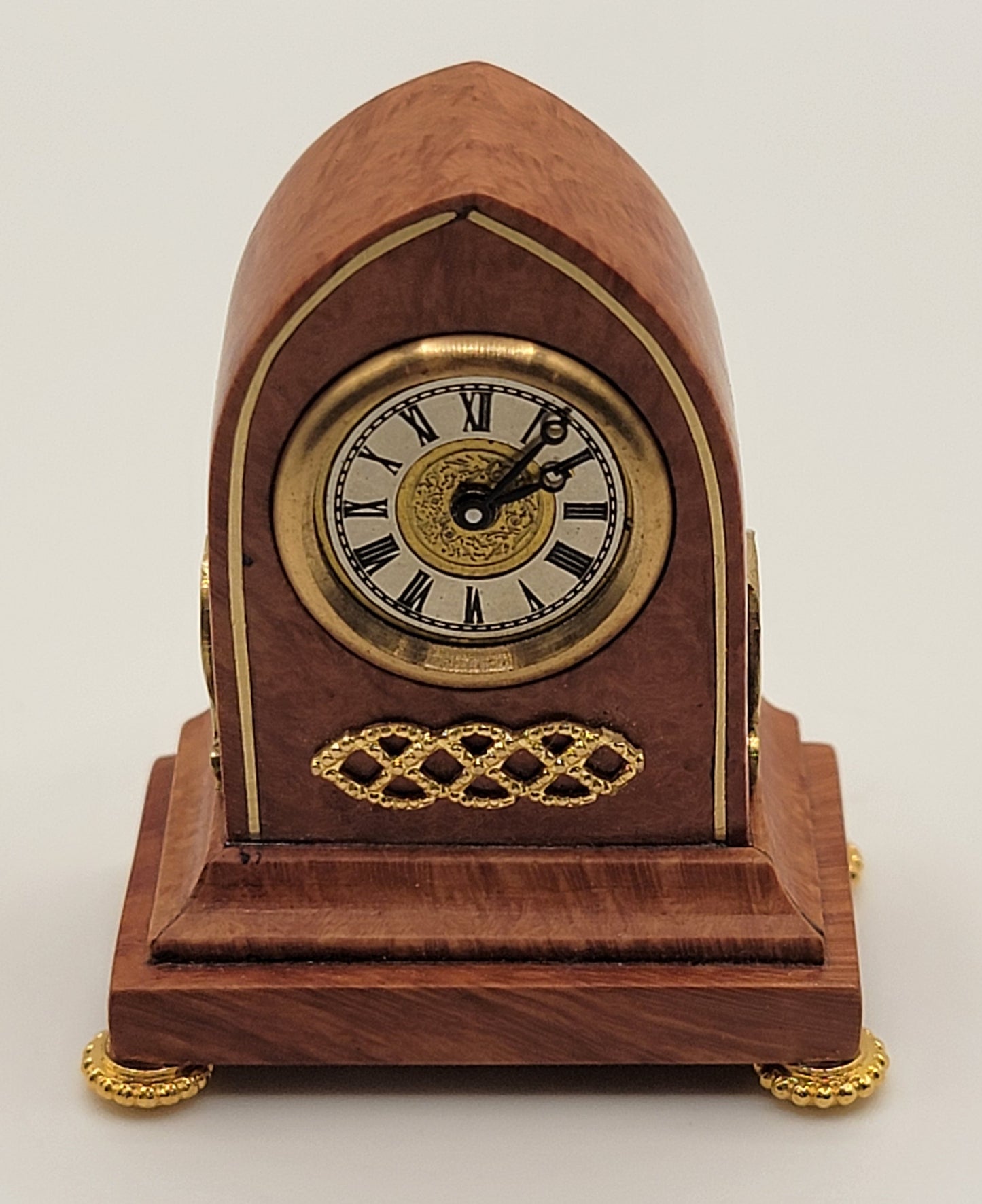Bakelite Cathedral Working Mantel Clock in Burled Wood. Easy to change the battery and beautifully finished with the brass accents. Artist Hermann Straeten.