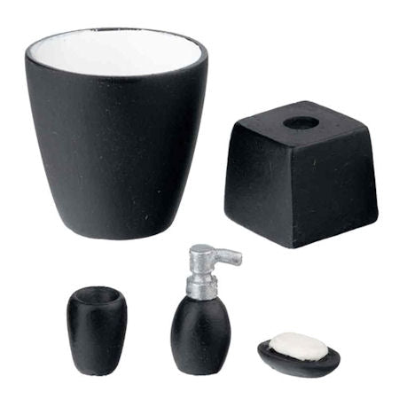 This bath set is designed with simple, classic style and a modern feel. Extremely detailed resin with no moving parts. Simply adhere a tiny piece of real tissue to the tissue box!