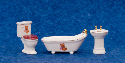 This Bathroom Set comes in White with an image of a teddy bear on the toilet and bathtub and inside the sink bowl. Set includes bathtub, sink, and toilet.