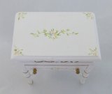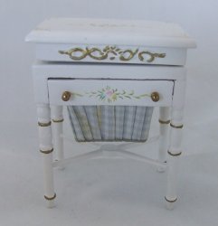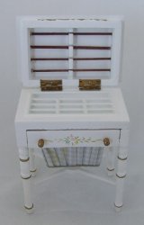 This Bespoke Tailoring Sewing Stand is made by Bespaq and comes in White with Hand painted floral design in greens, yellow, pink with a hint of light blue. Stand has a blue and white check basket below drawer and top opens up to many compartments for your sewing accessories.