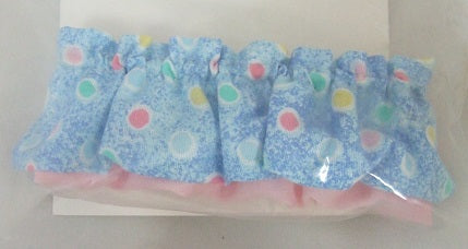 This Double Valance has pink underneath and a blue with pastel color dots on top.