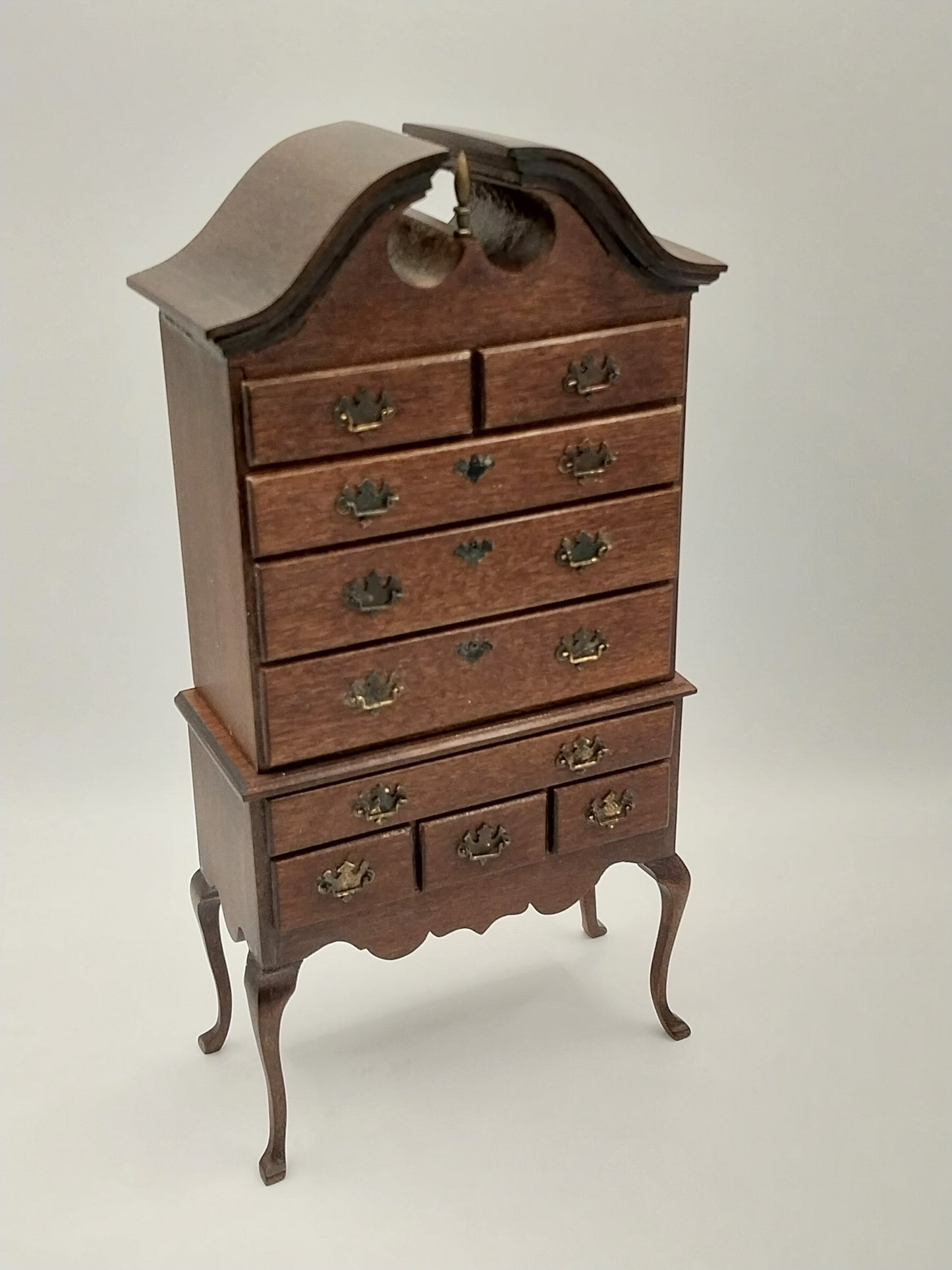 This Bonnet Top High Boy is made of Walnut wood by Artisan Walter Krenske. High Boy has 9 working drawers. Piece is signed by Artisan.