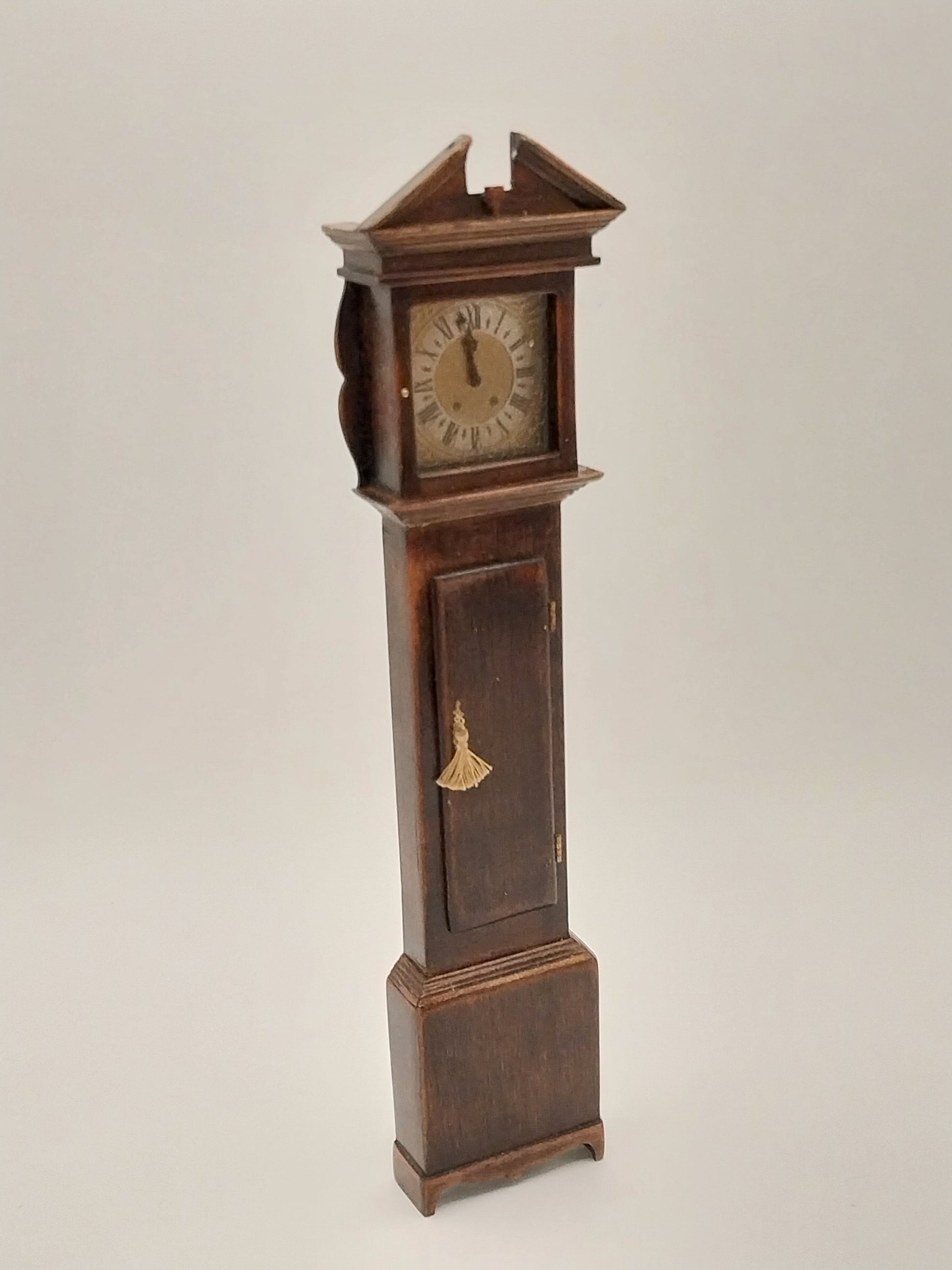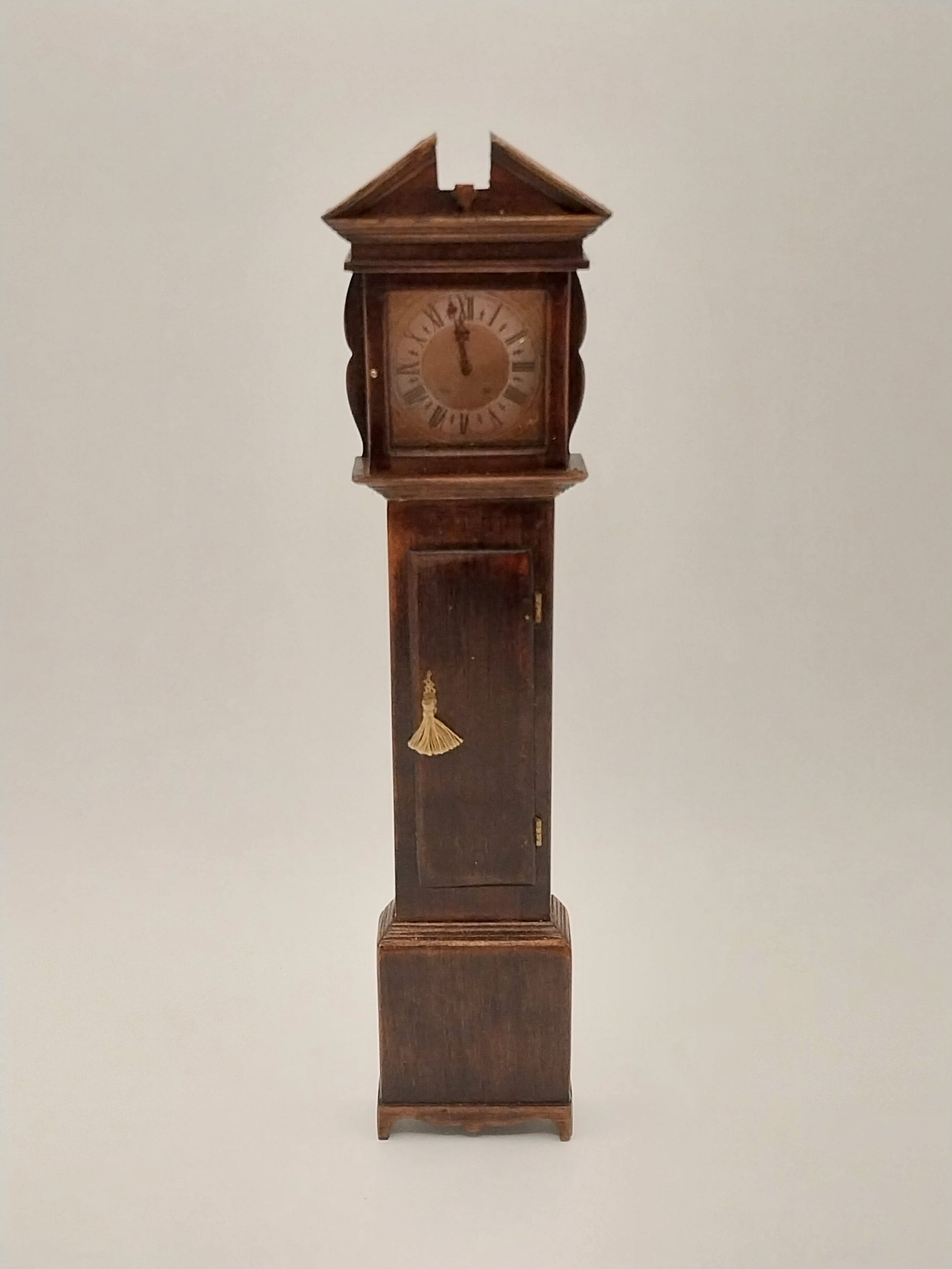 This Broken Pediment Country Longcase Clock is done in a Fruitwood with an antique patina by Artisan Keith Bougourd. This Clock is based on an original dating around 1730 C. Clock has a simple design and the trunk opens to reveal a single weight and pendulum. Piece is signed and dated 2016 by Artisan.