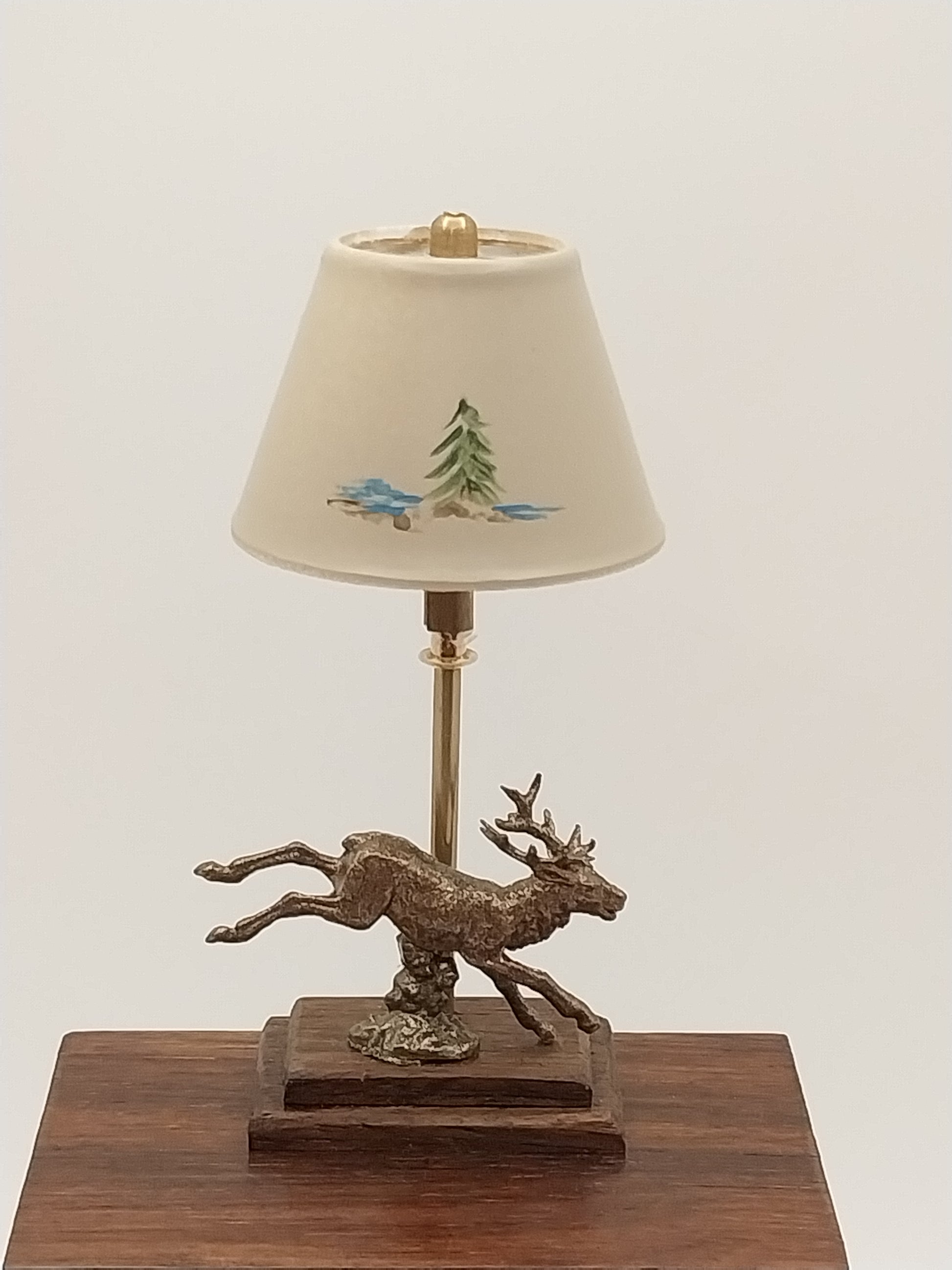 This Table Lamp has wooden base with Bronze jumping deer figurine on base. Lamp has hand painted trees and water scene on shade. Lamp works with a 12 Volt Electrical System.