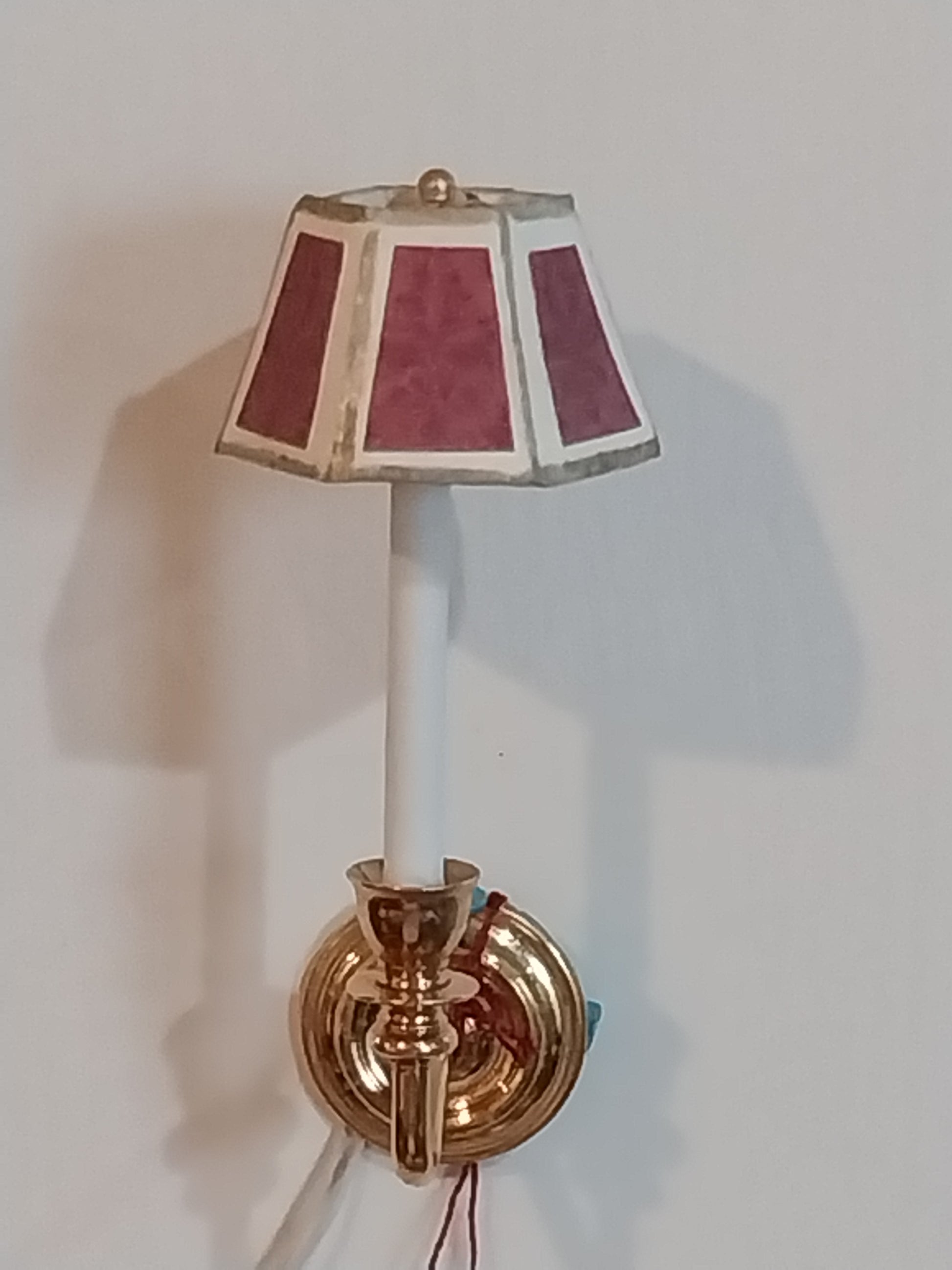 Brass sconce with burgundy shade. Uses replaceable bi-pin bulb, and works with a 12 Volt Electrical System