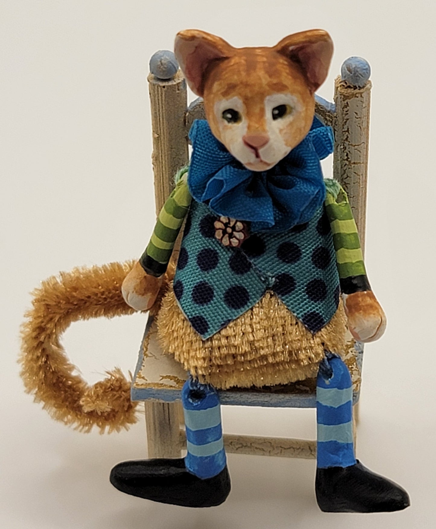 Hand painted, molded, and jointed pose-able cat. Bright & cheery vest, velvet body & tail and fully joined at hands and feet. Artist K. Kuti Designs